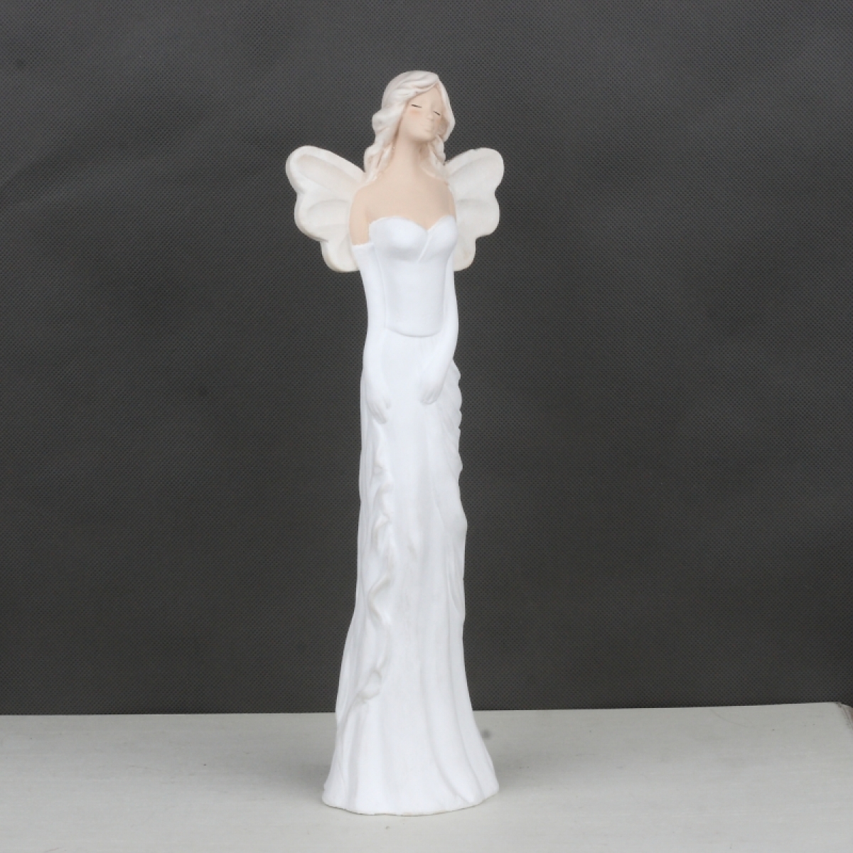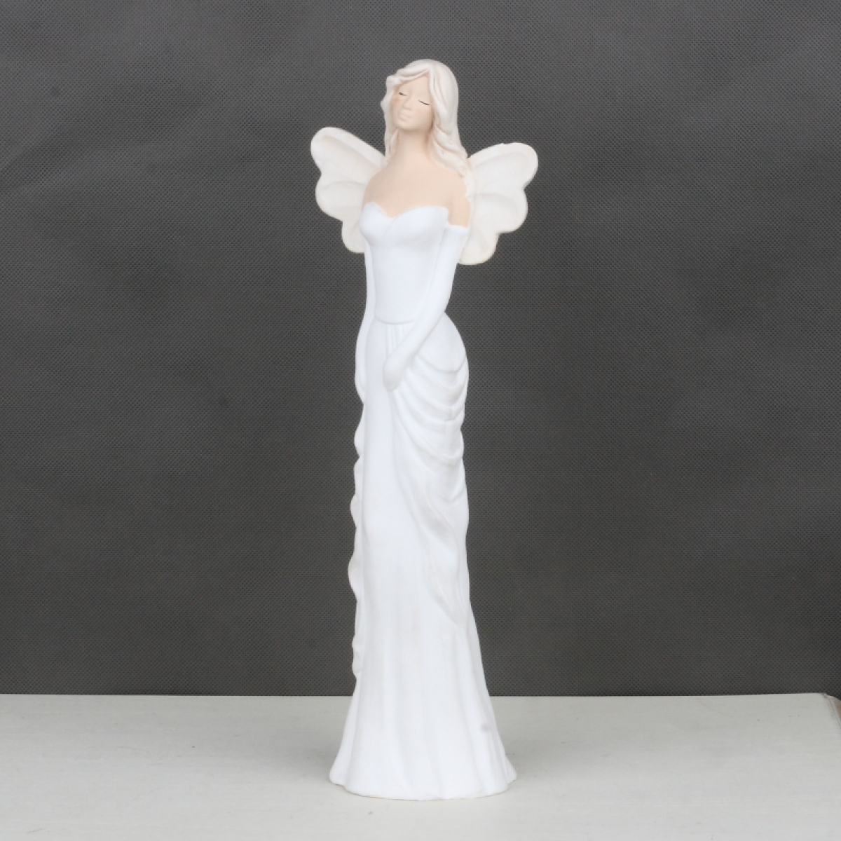 Anjel má dlhé biele šaty a rukavičky.