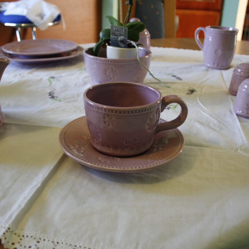 Šálka a talierok z obrázku sú vyrobené z ružovej kameniny ozdobené rôznymi kvietkami a inými ornamenty .