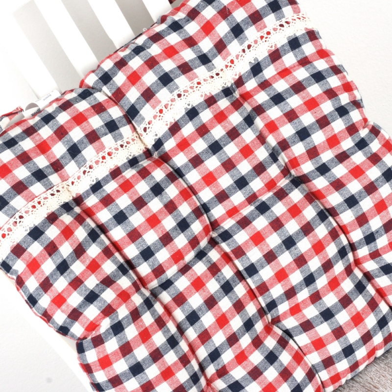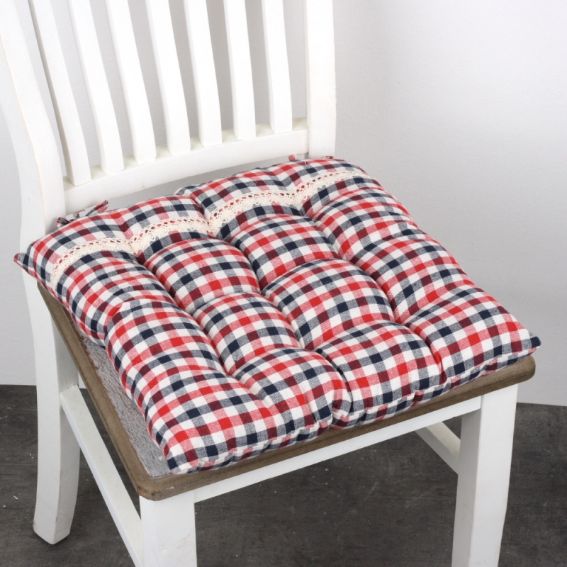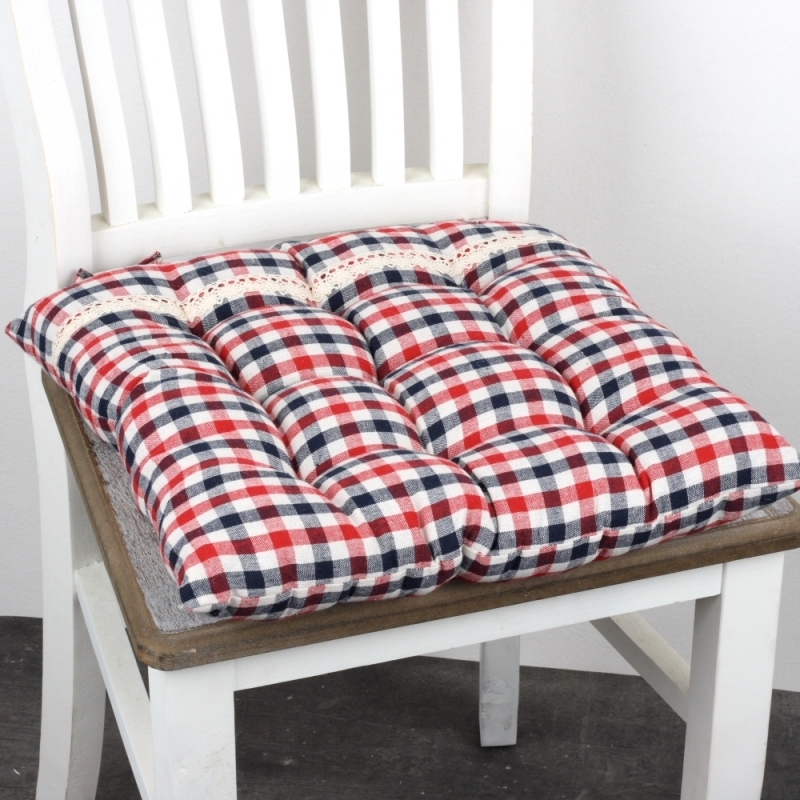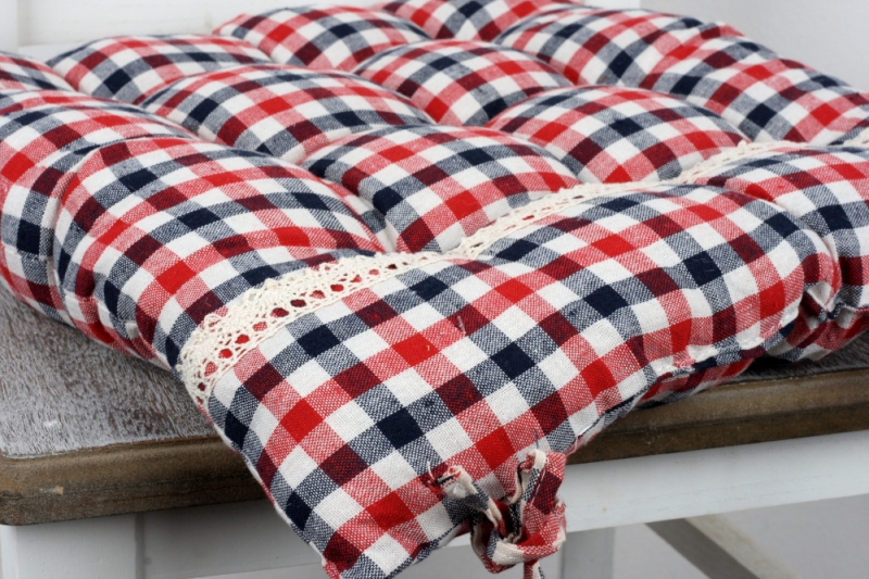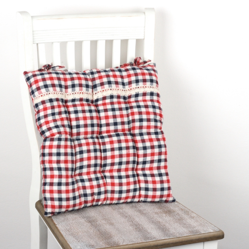 Sedák na stoličku je celý ušitý z látky s károvaným motívom a je ozdobený krémovú čipkou . Sedák má šnúrky na pripevnenie k stoličke.