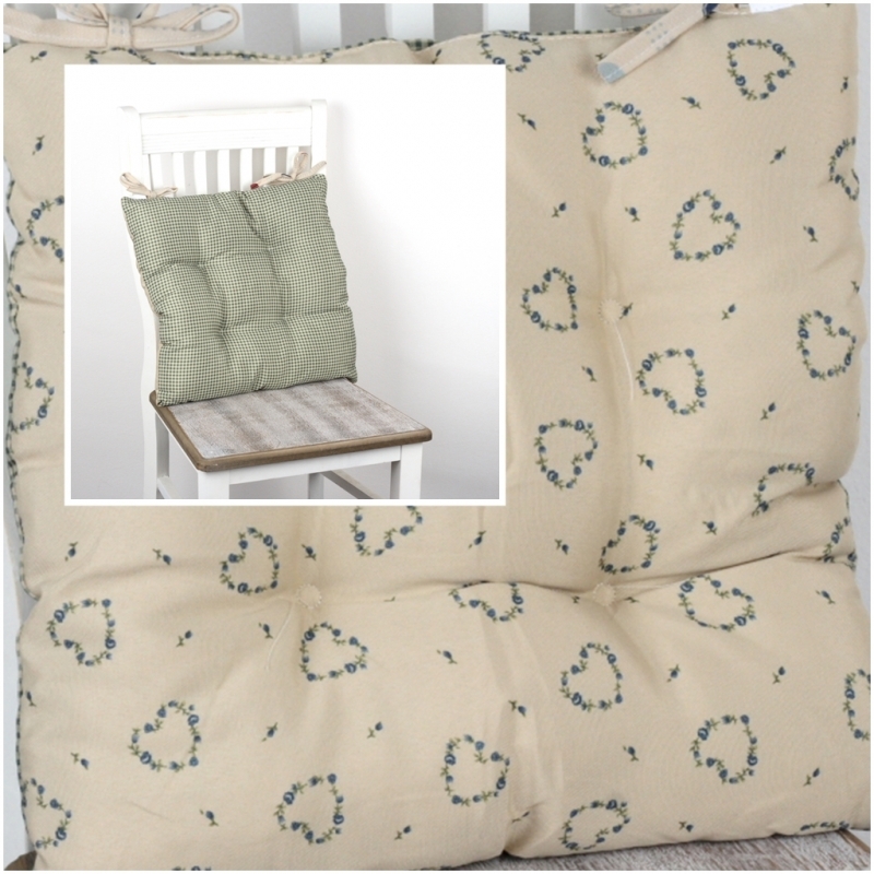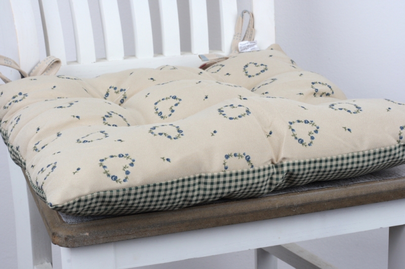 Sedák na stoličku je z jednej strany z látky s kockovaným vzorom, z tej druhej je látka posiata srdiečkami z malých kvietkov. Sedák má šnúrky na pripevnenie k stoličke.