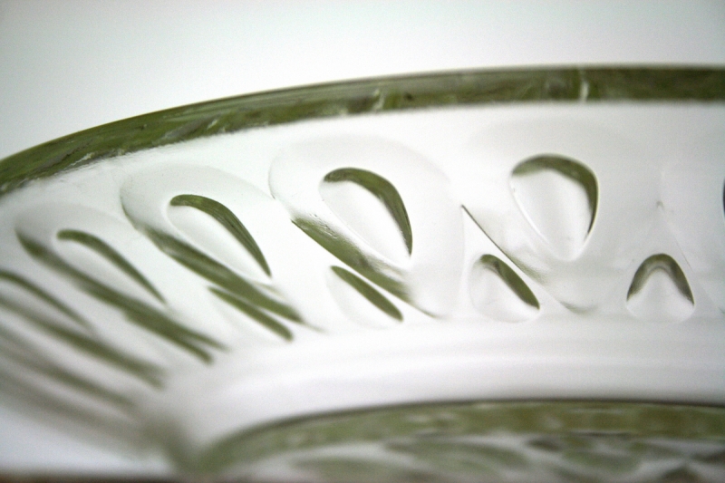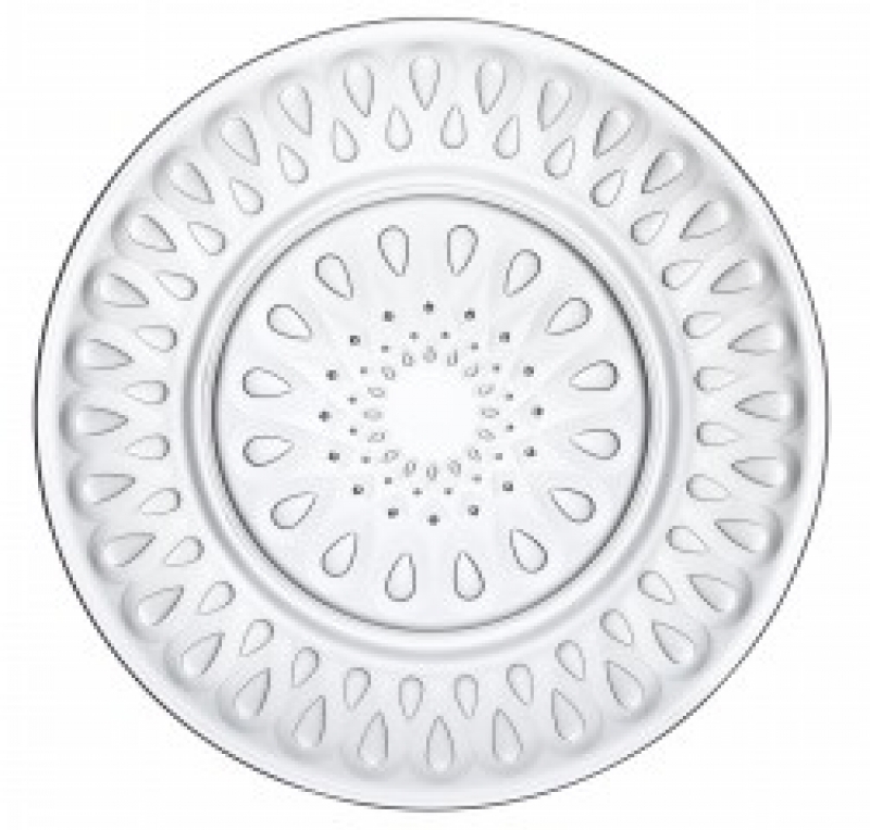 Tanier z lisovaného skla so zdobením v mandľovom tvare. Zdobenie má na okraji taniera aj na stredu.