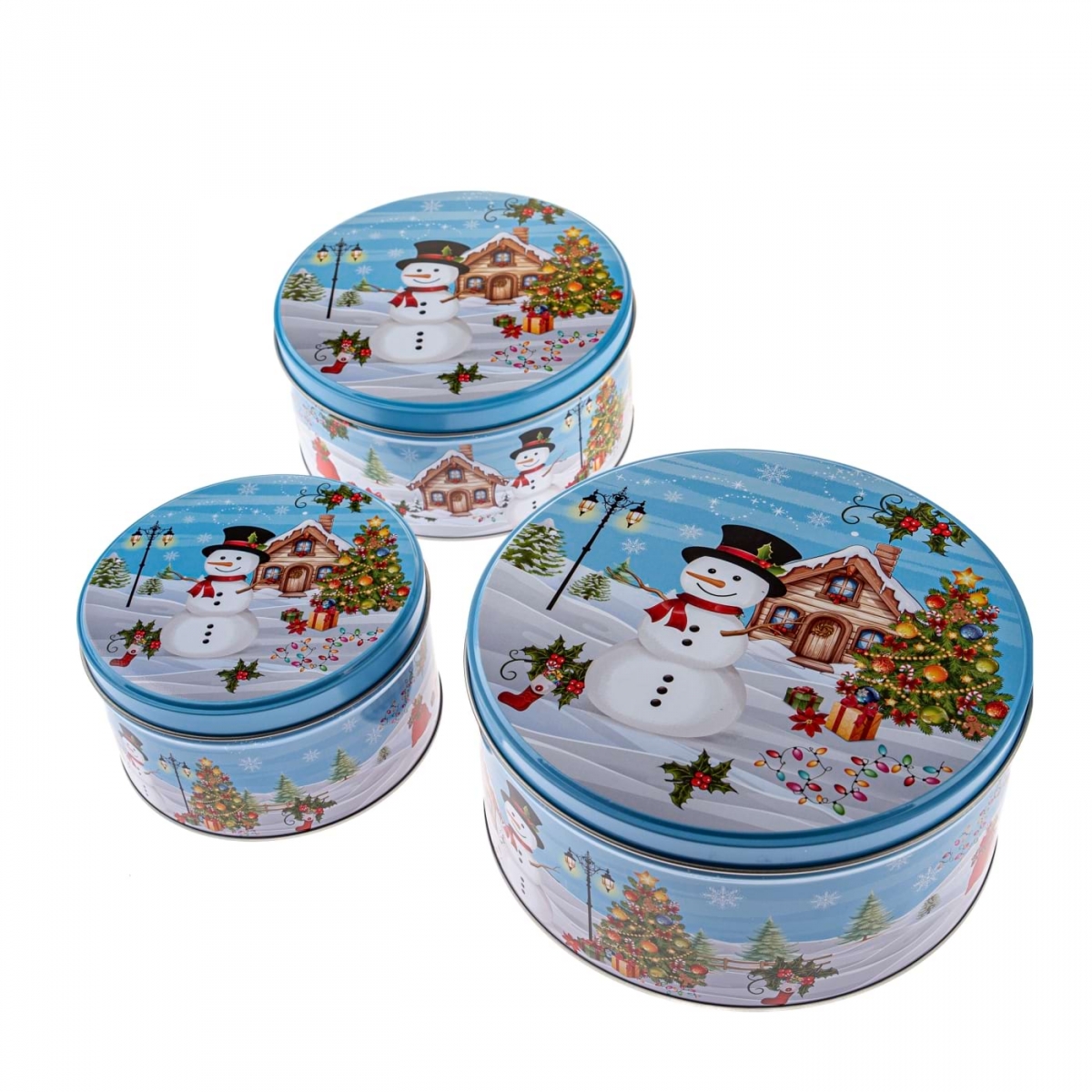 Sada 3 plechových dóz na pečivo so snehuliakom – 19,5 × 19,5 × 9 cm