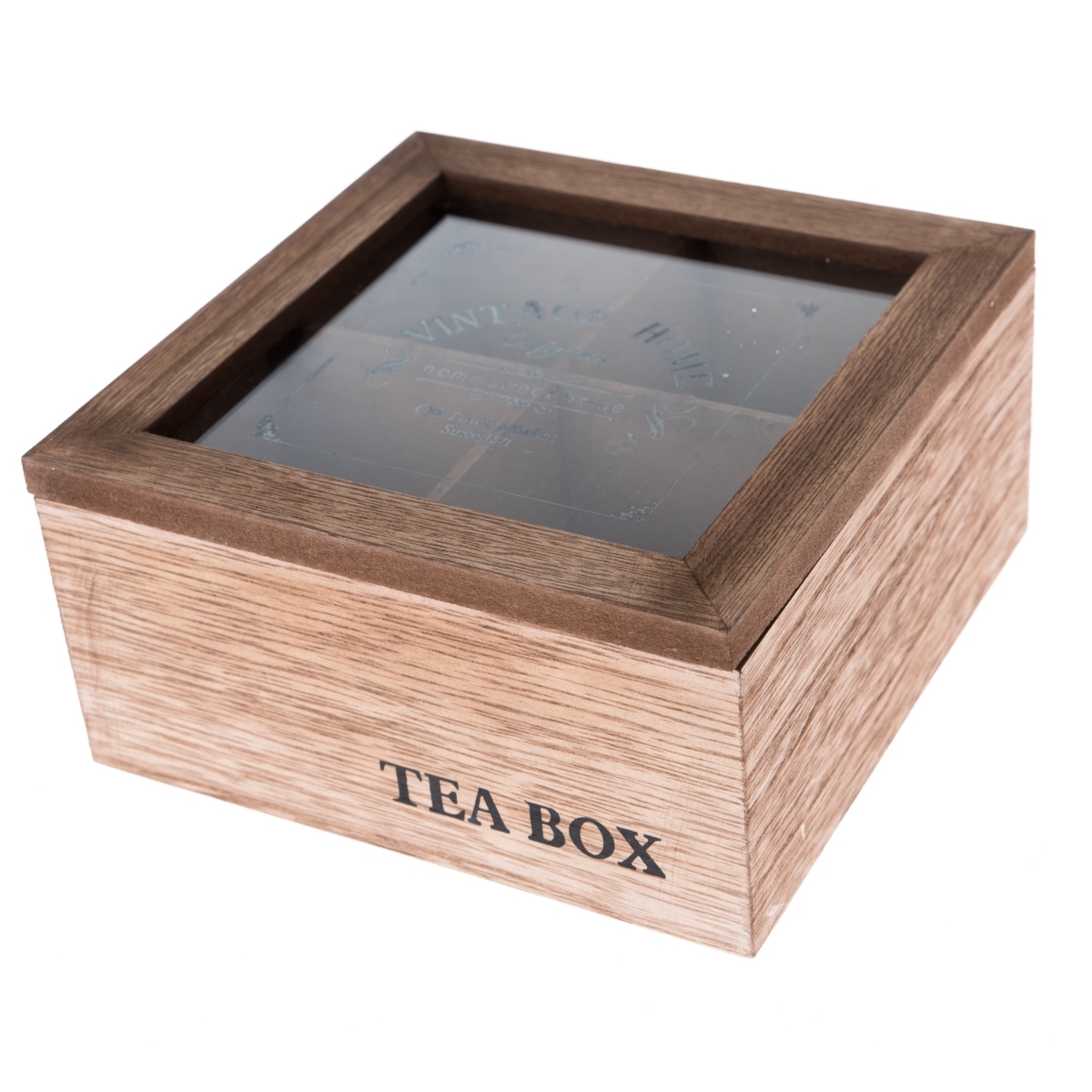 Krabička na čaj so skleneným vekom a nápisom TEA BOX má štyri praktické priehradky na uloženie Vášho obľúbeného čaju. Vrecká s čajom už teda návšteve nemusíte ponúkať z nevzhľadných papierových škatuliek.