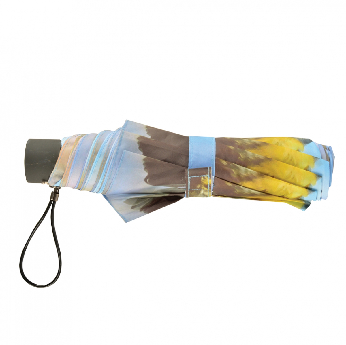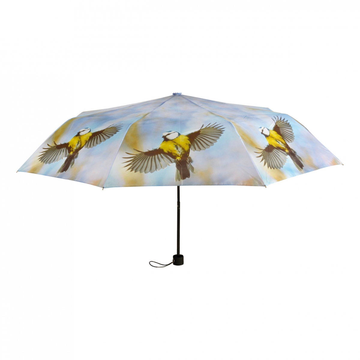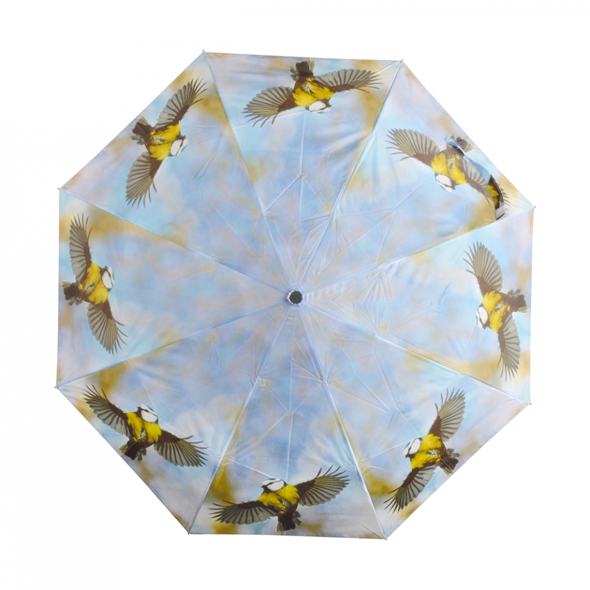 Skladací dáždnik s kovovou rukoväťou opatrenú plastovým úchopom. Skladací dáždnik je opatrený potlačou s motívom letiaci sýkorky.