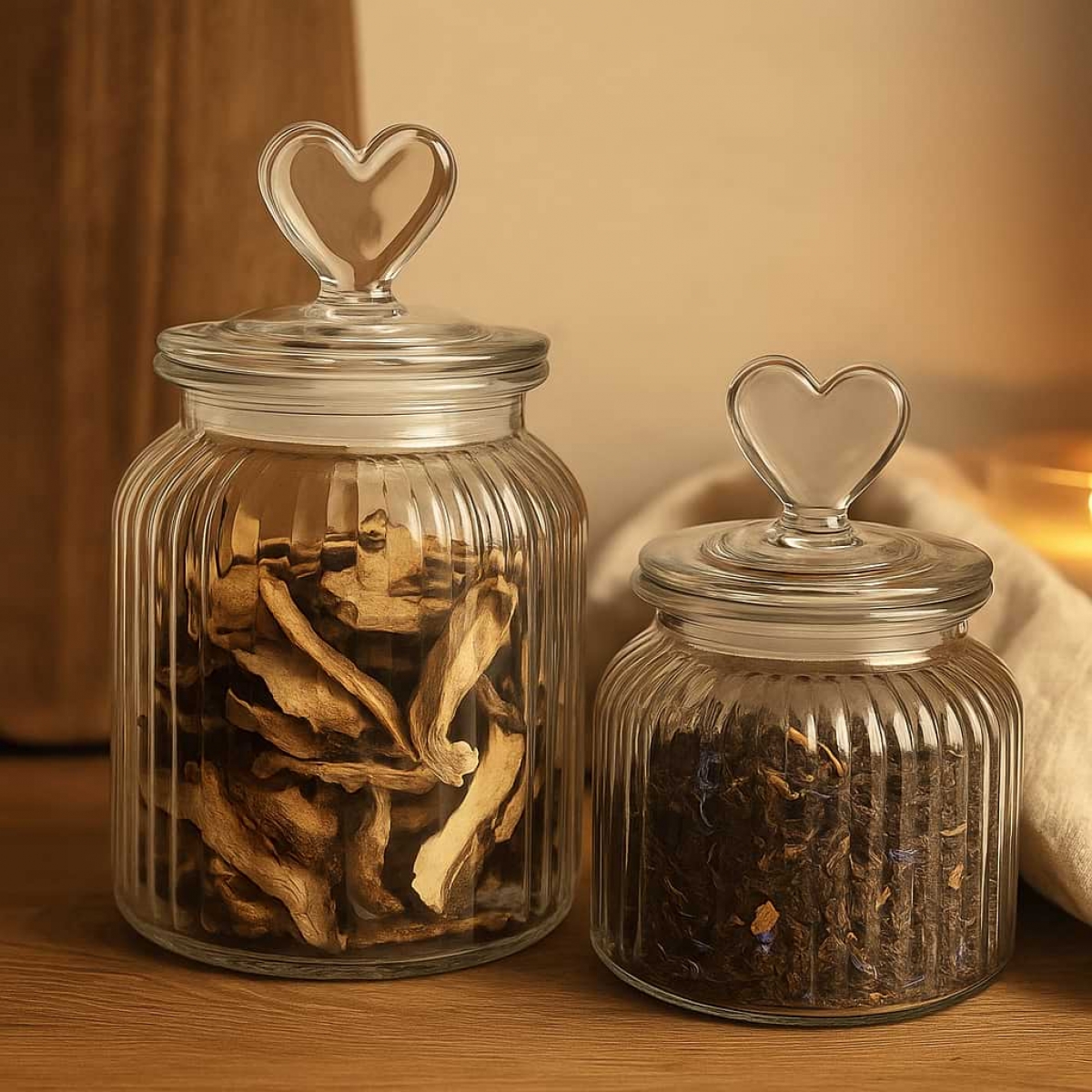 Sklenené dózy sa dajú ľubovoľne kombinovať – menší aj väčší rozmer spolu dokonale ladia, takže vytvoríte harmonickú sadu pre celú kuchyňu. Vďaka hladkému povrchu sa ľahko čistí a vďaka tvarovanému viečku so srdcom sa stávajú nielen funkčnou pomôckou, ale aj malým symbolom starostlivosti a lásky k detailu.