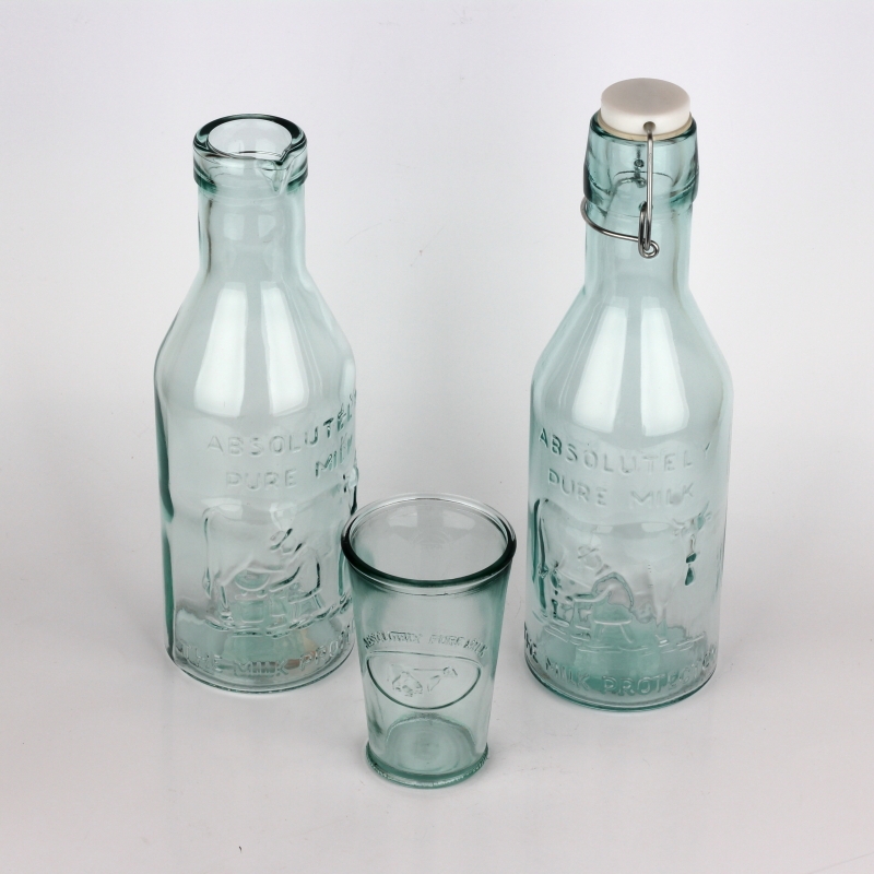 Sklenená fľaša na mlieko má výlevku pre ľahké nalievanie mlieka. S rovnakým motívom nájdete v ponuke tiež poháre a fľašu s uzáverom.