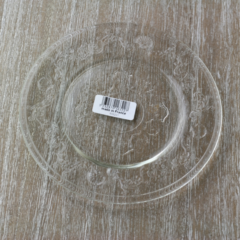 Malý tanier z lisovaného skla so zdobením v barokovom štýle - kvety a mušle. Stolové sklo z kolekcie sklárne La Rocher má typický francúzsky šarm. Spolu s riadom vnesiete kúsok Francúzska aj k Vám domov.
