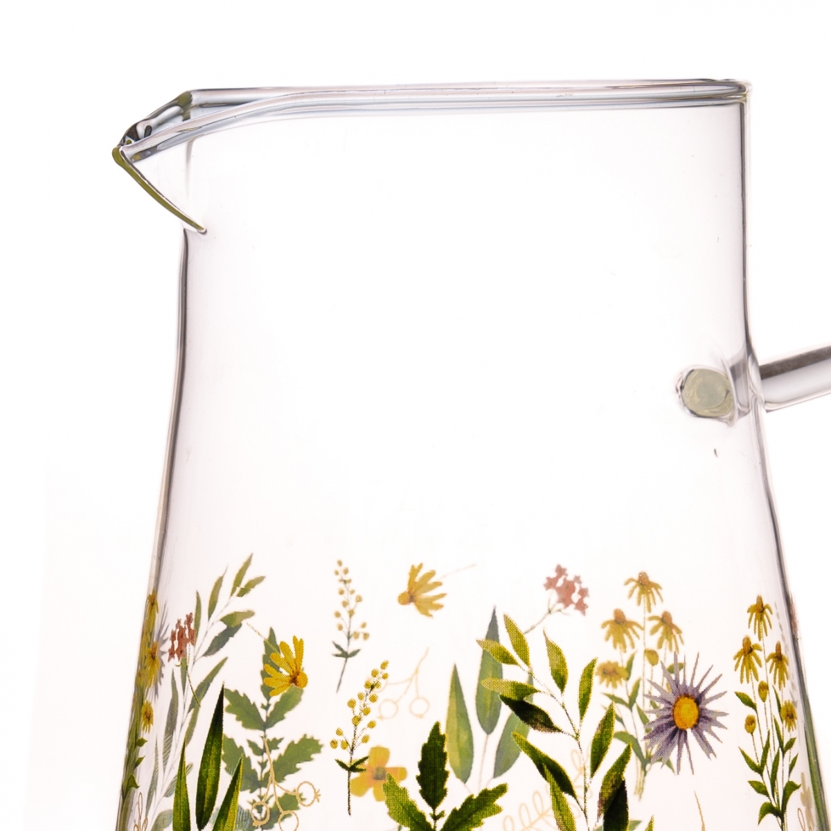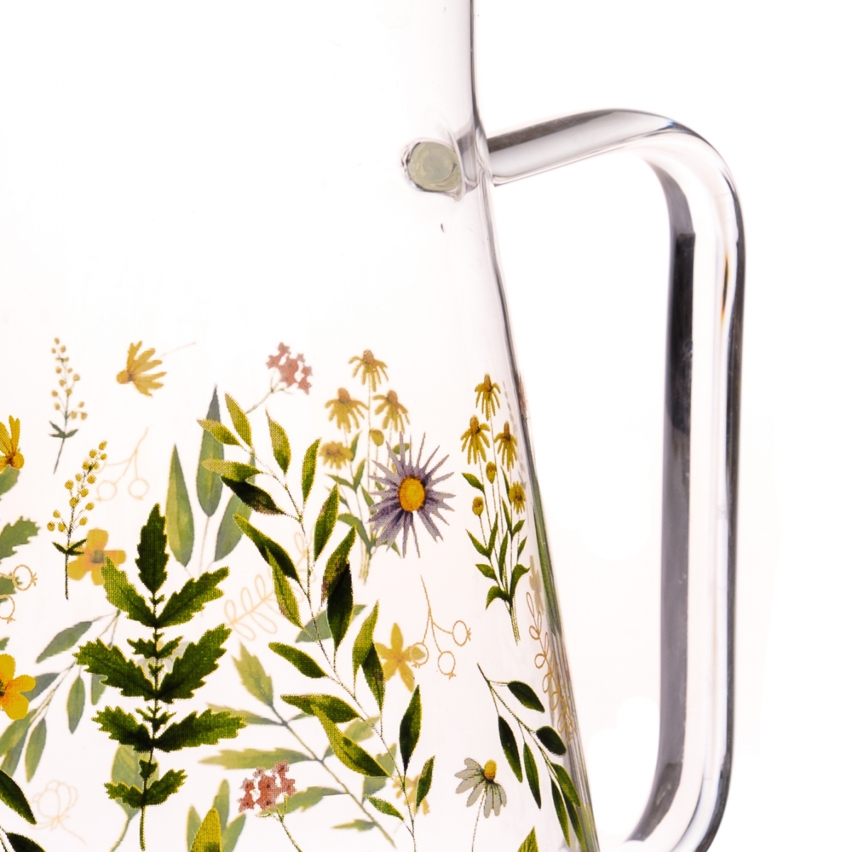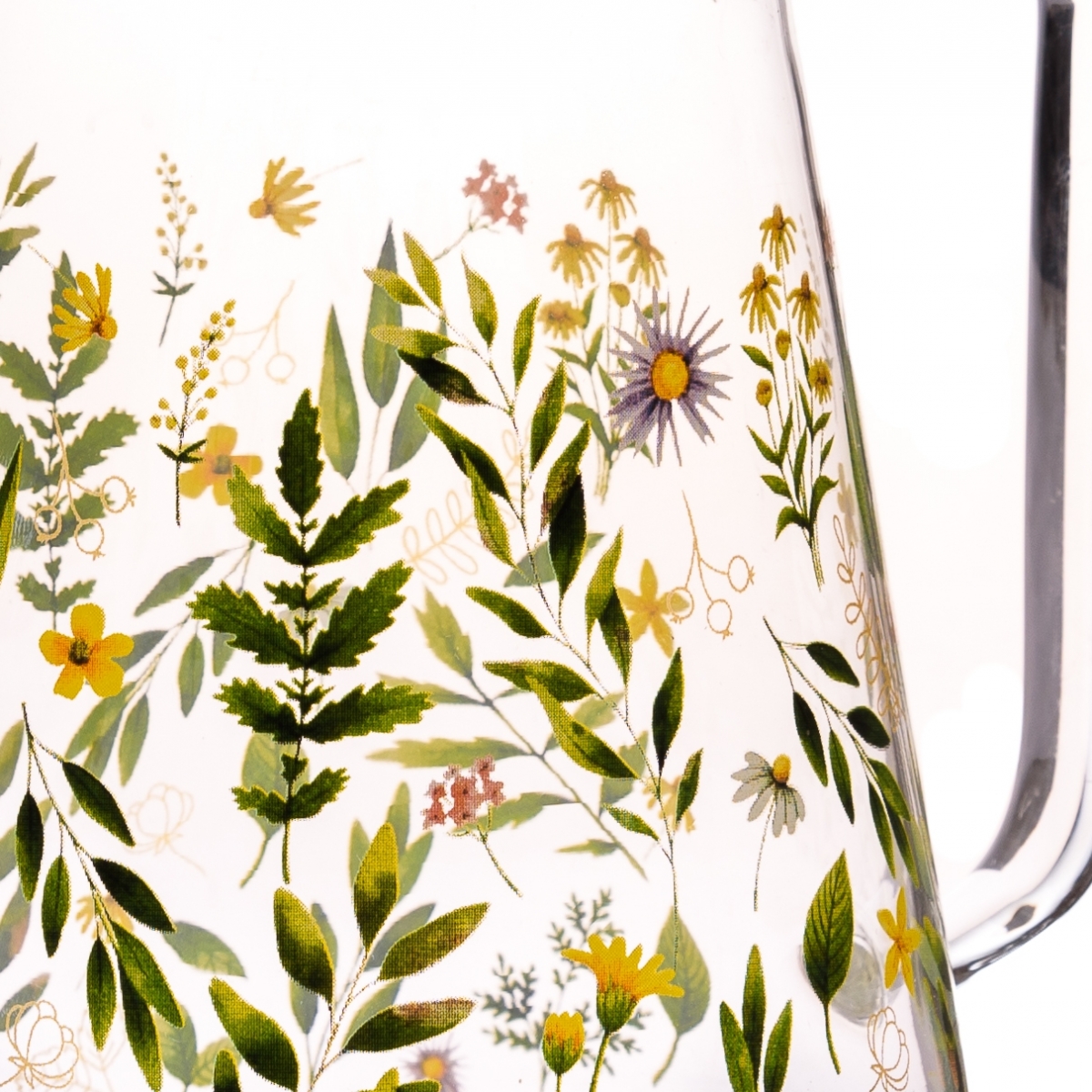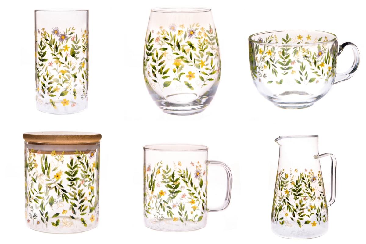 Dekorácia do kuchyne z kolekcie Lúčne kvety obsahuje veľké sklenené hrnčeky, maľované poháre, hrnčeky v tvare šálok na čaj, dózy s bambusovými viečkami rôznych objemov a maľovaný chalupársky džbán na vodu zo studne. Každý kúsok je ručne vyrobený pre najvyššiu kvalitu a autentickosť.