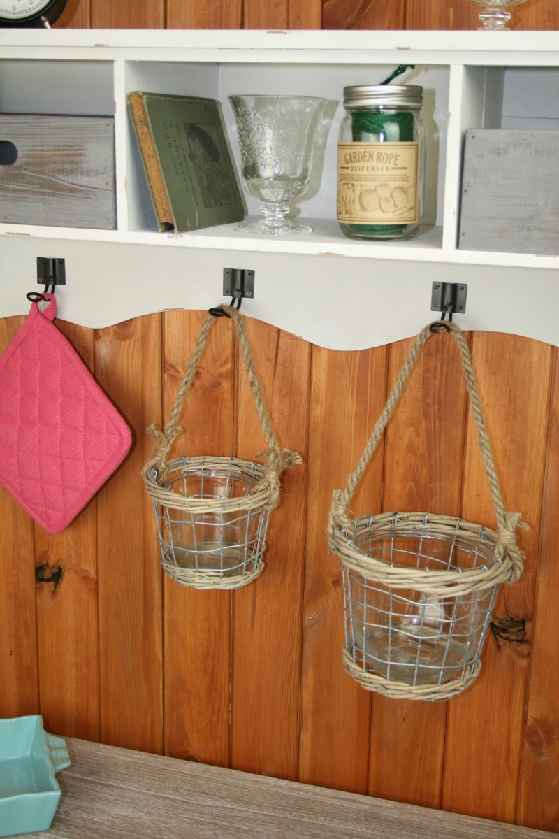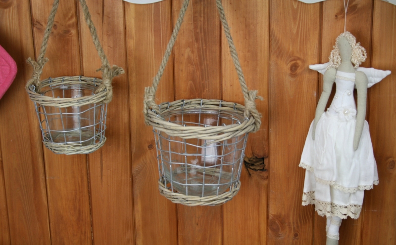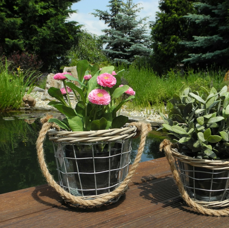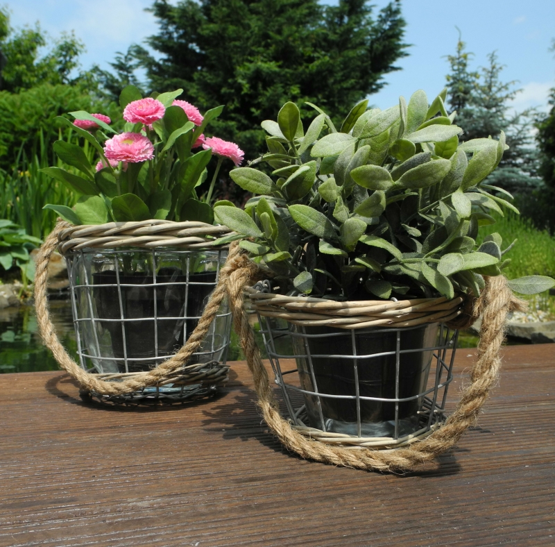 Sklenený kvetináč je zasadený do drôteného výpletu, doplnený o prútie a lykové povraz.