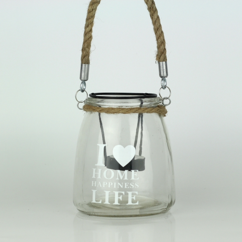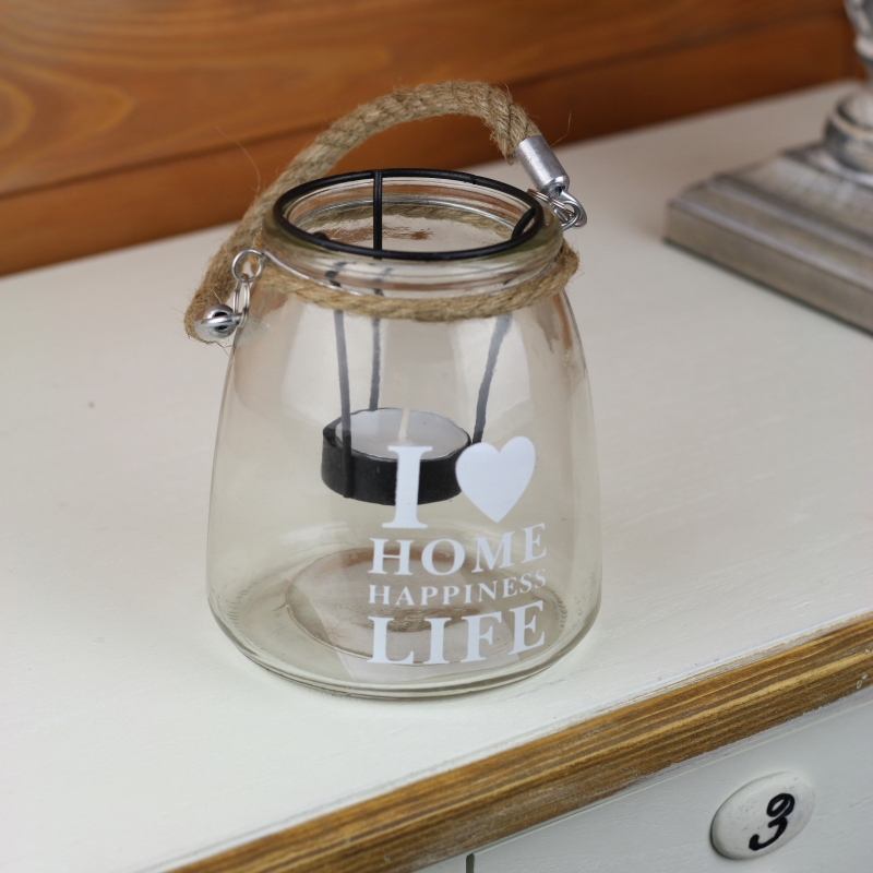 Sklenený svietnik I love home 14cm na jednu čajovú sviečku, ktorá zahalí priestor romantickým tlmeným svetlom.