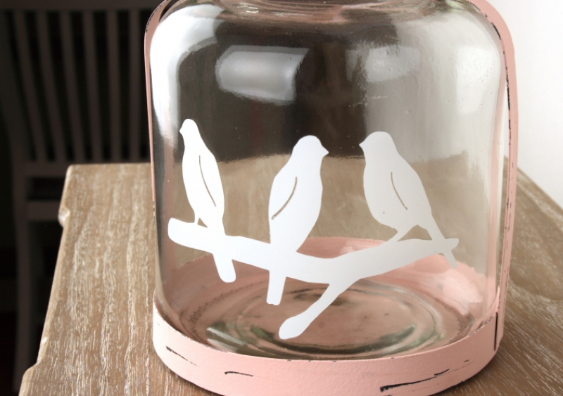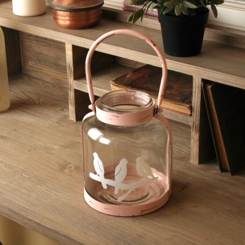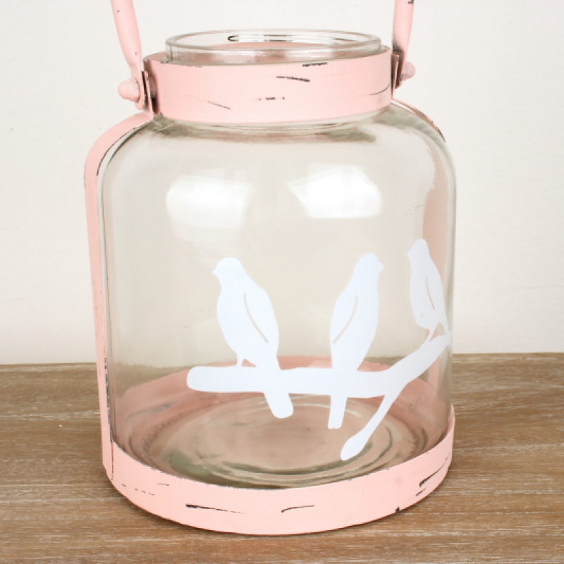 Sklenený svietnik s kovovým uchom ružový 18cm a motívom vtáčikov na vetve v nás vyvoláva jarnú náladu.