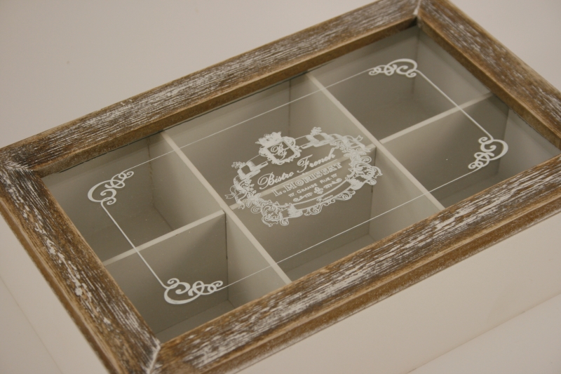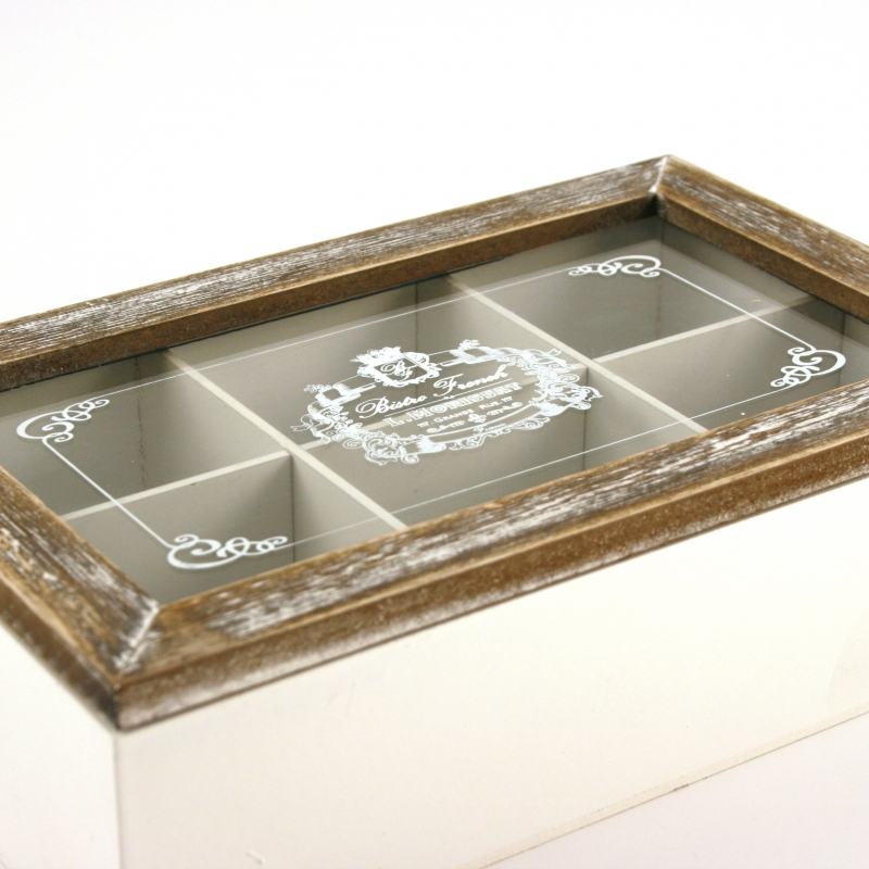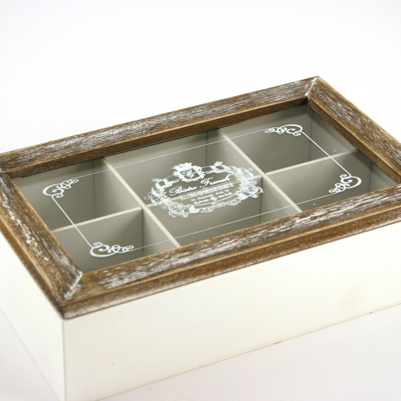 Skrinka na čaj má sklenené dvierka , takže ihneď uvidíte , aké čajové variácie skrýva . Sklenené dvierka sú navyše veľmi pekne zdobená bielym motívom . Táto krabica môže byť aj veľmi príjemným darčekom .