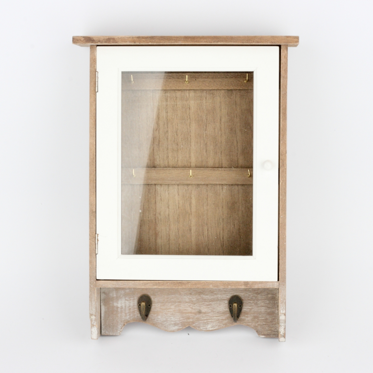 Skrinka má presklené dvierka s bielym rámom, ktorý je pekne kontrastný ku zvyšnej skrinky v prírodnej farbe dreva. Vo vnútri má 6 háčikov na kľúče a v spodnej časti skrinky naviac 2 veľké háčiky na drobnosti.