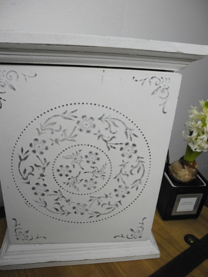 Biela skrinka na kľúče s reliéfom na dvierkach - kvetinový motív. Skrinka má 6 háčikov na kľúče. zo zadnej strany dva kovové úchyty pre jednoduché zavesenie na stenu (kovové pánty, kovové zatváranie dvéřek).