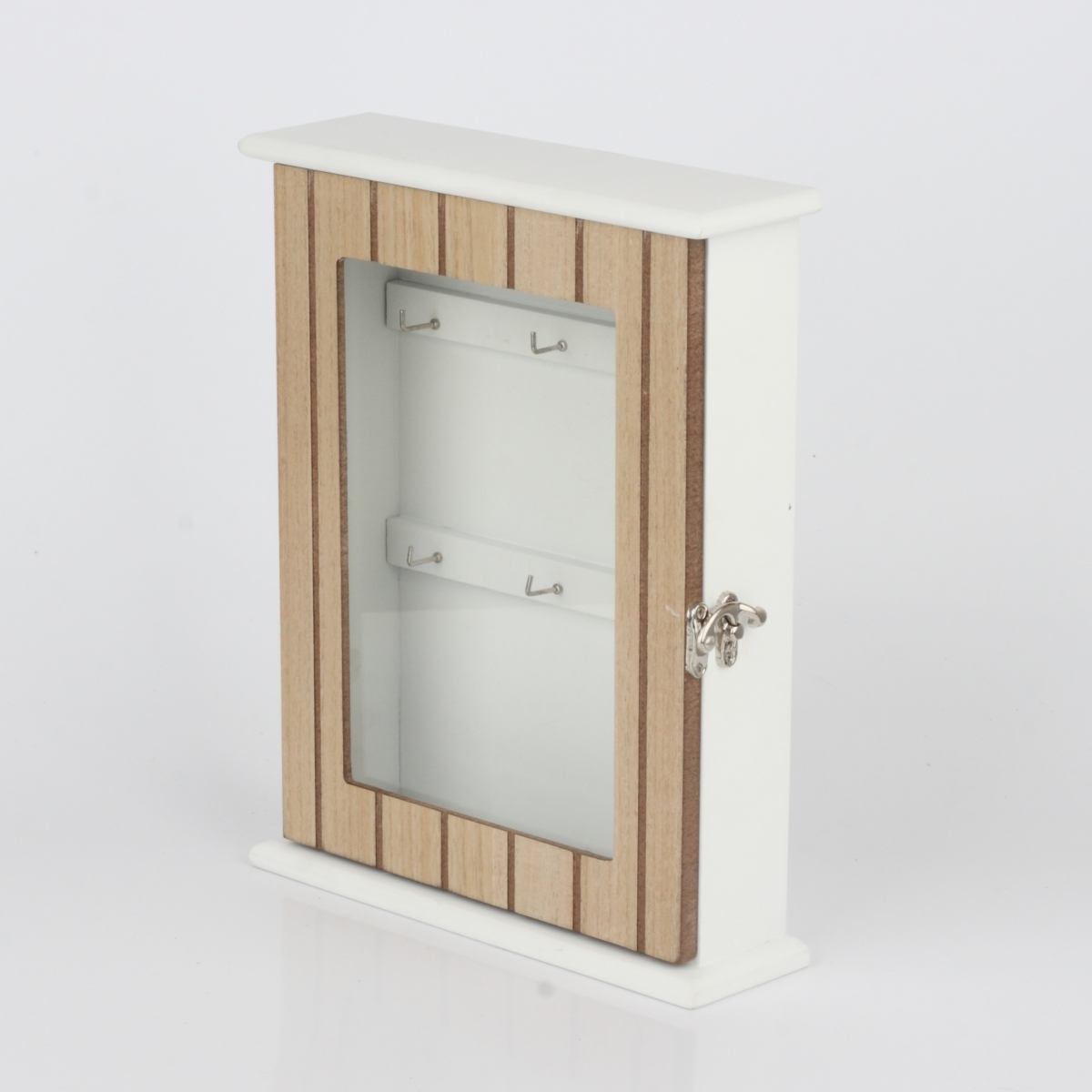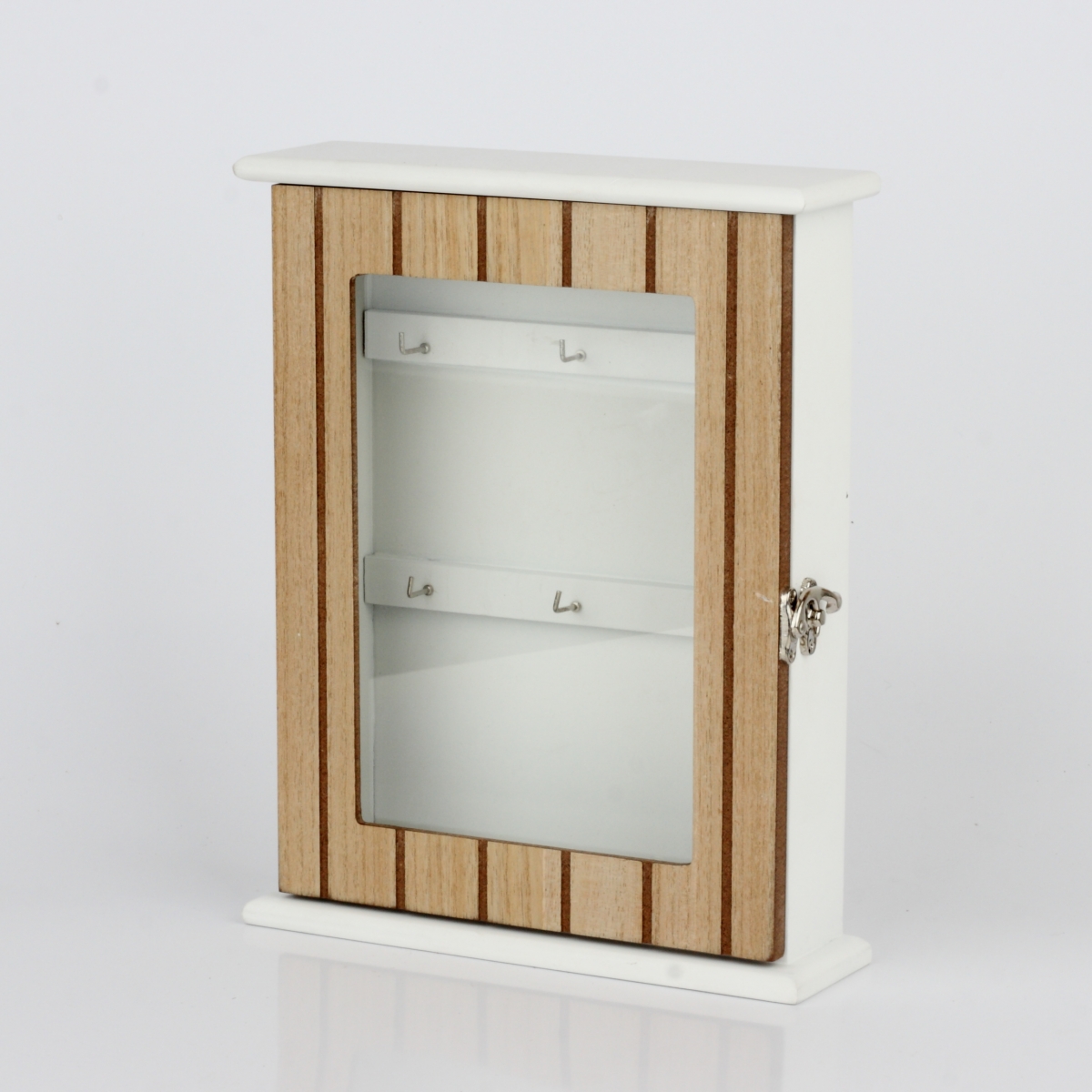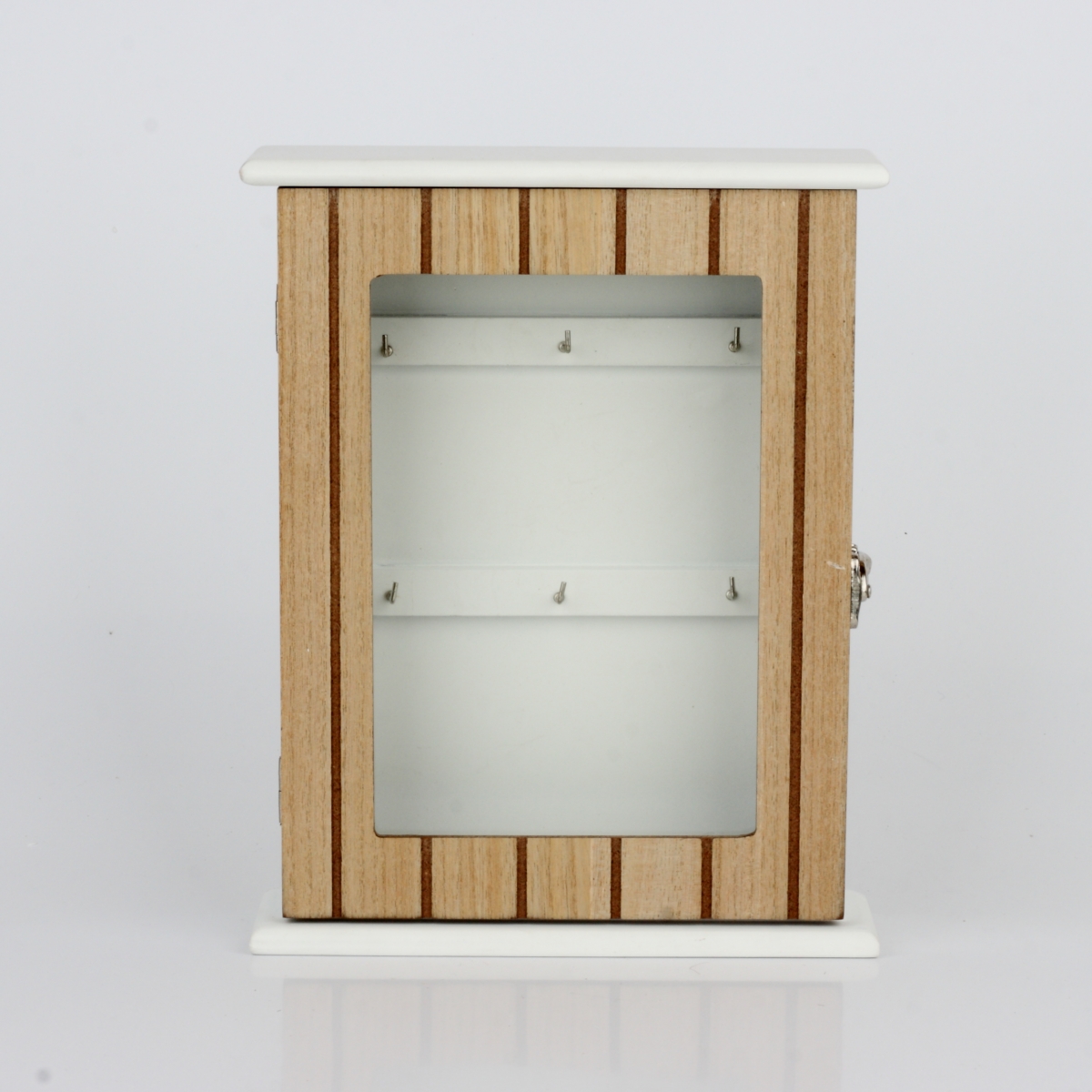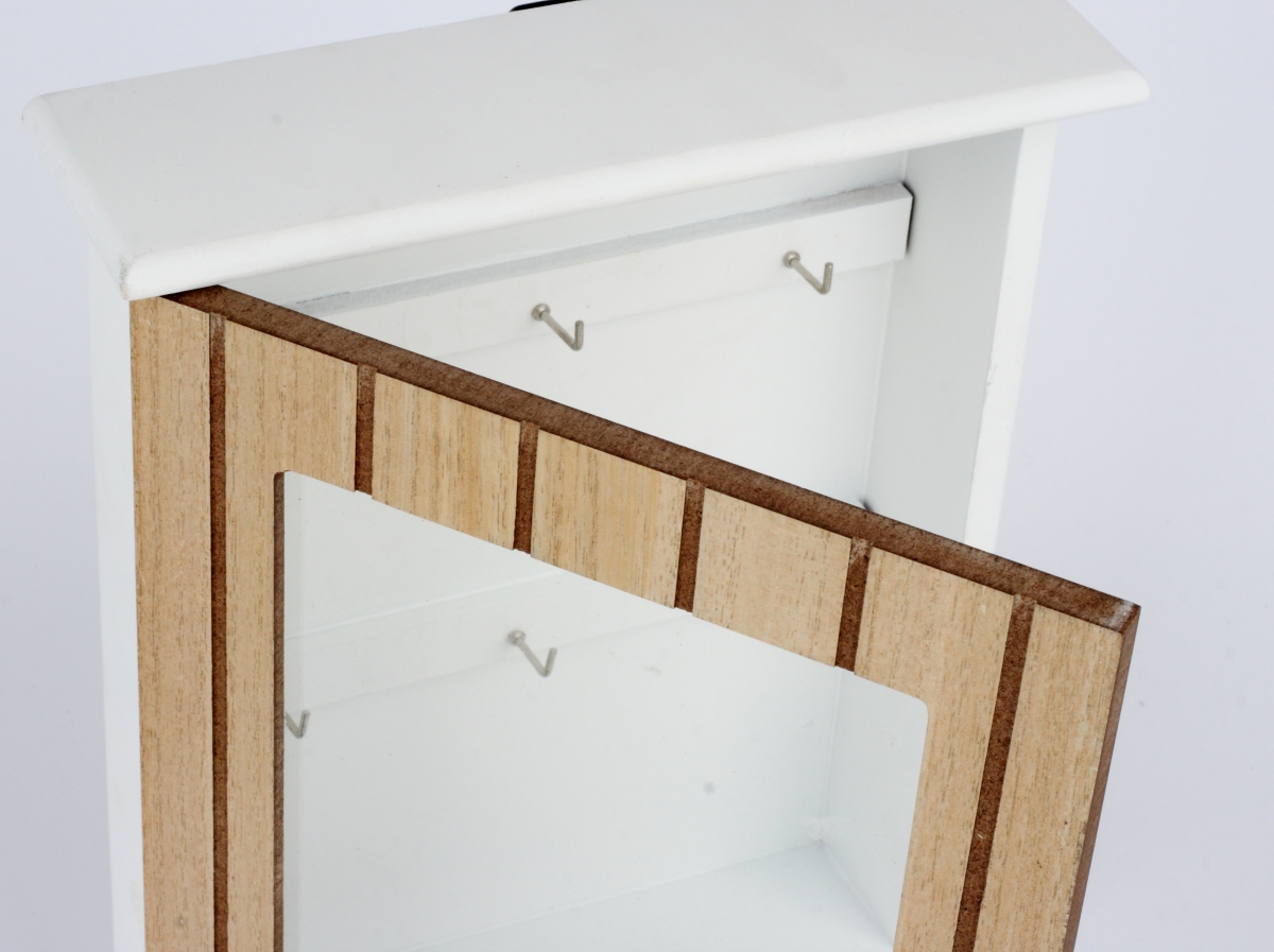 Skrinka má presklená "drevenými" dvierka a vo vnútri 6 háčikov na kľúče.