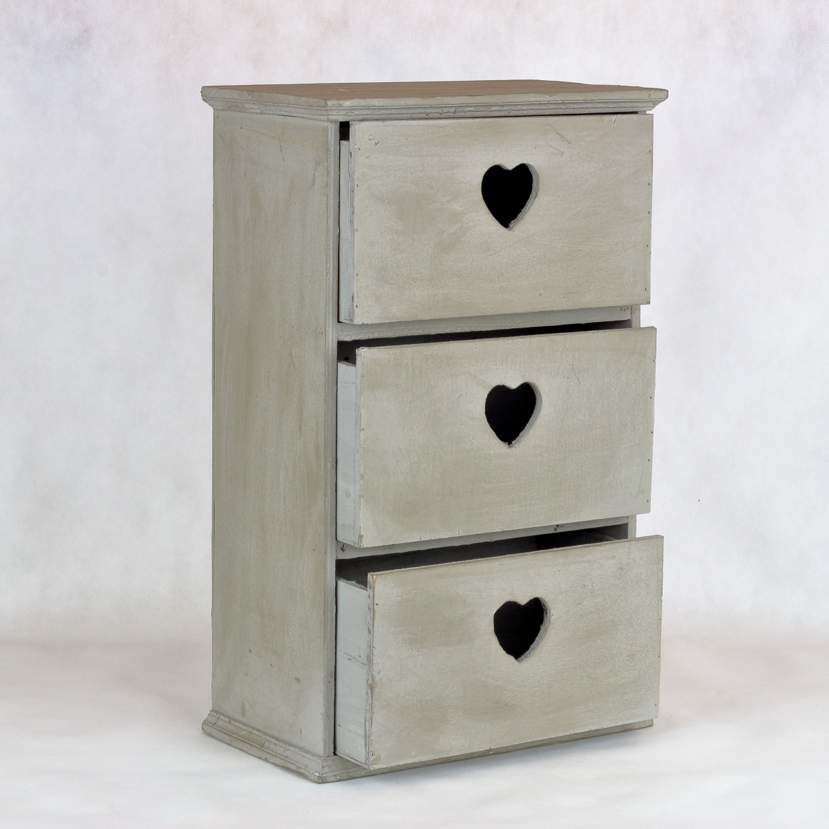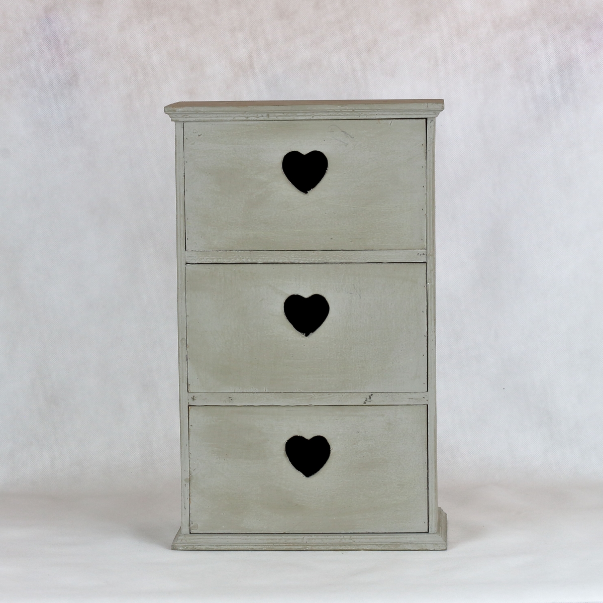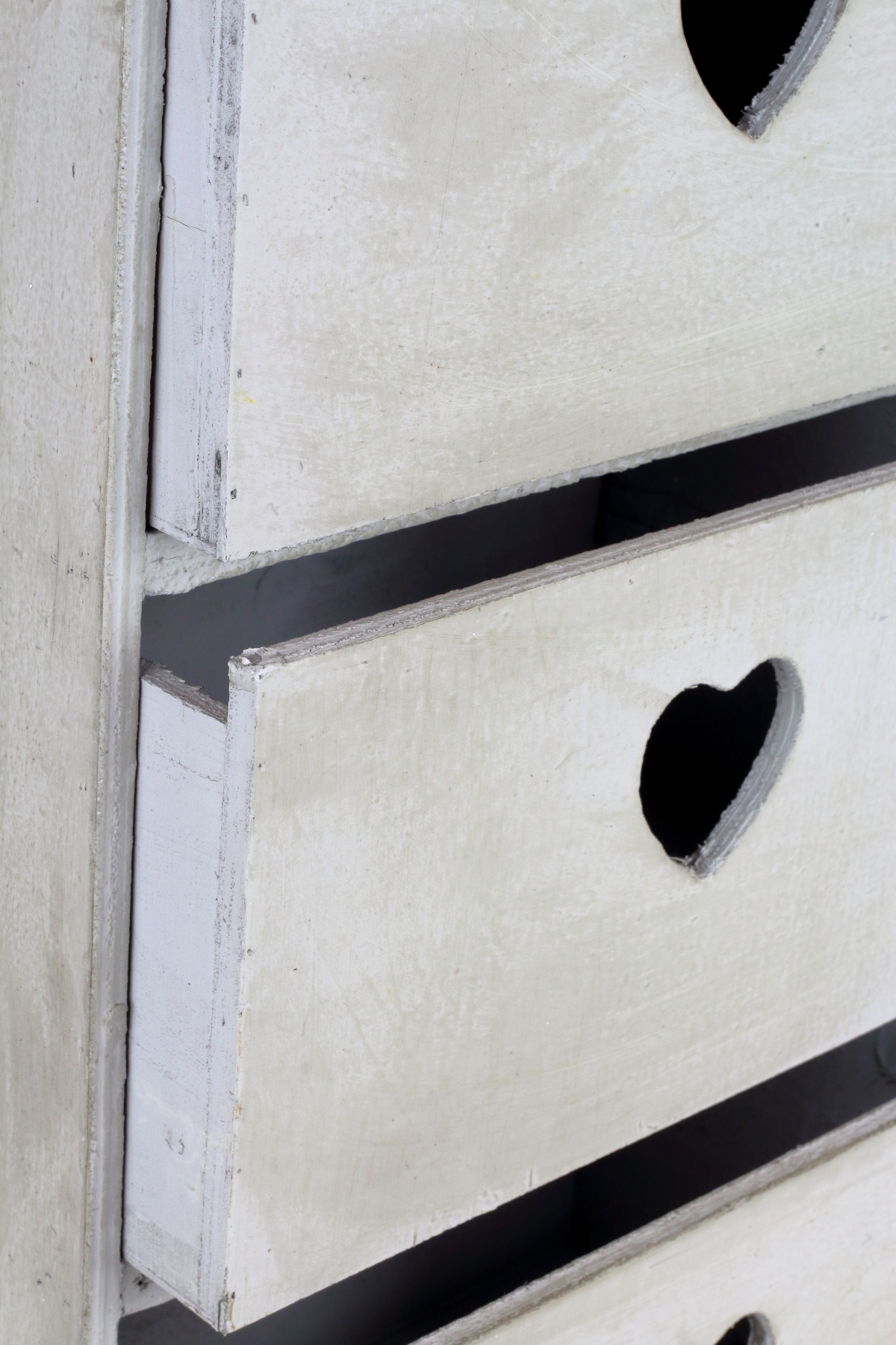 Romantický motív srdce je vyrezaný do každého šuplíčku. Jemné tóny s patinou skrinke pristane a perfektne zapadne do vidiecky ladeného interiéru.
