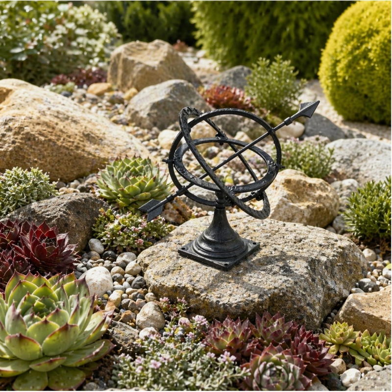 Tieto kovové slnečné hodiny nie sú len dekoráciou. Sú to záhradné hodiny s atmosférou, ktoré priťahujú pohľad pokojne, nenápadne a napriek tomu výrazne. Hodia sa tam, kde nechcete len vyplniť prázdne miesto, ale kde chcete vytvoriť pocit upravenej záhrady, ktorá má svoj štýl, nápad a jemný dotyk histórie.