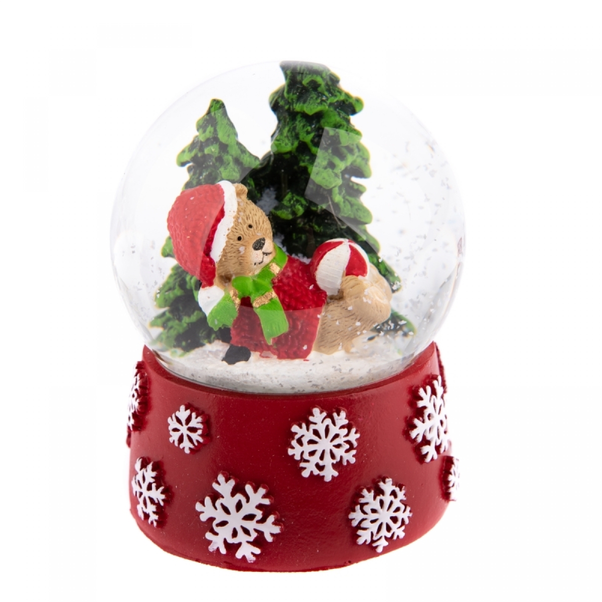 Sněžítko s medveďom na červenom podstavci s vločkami