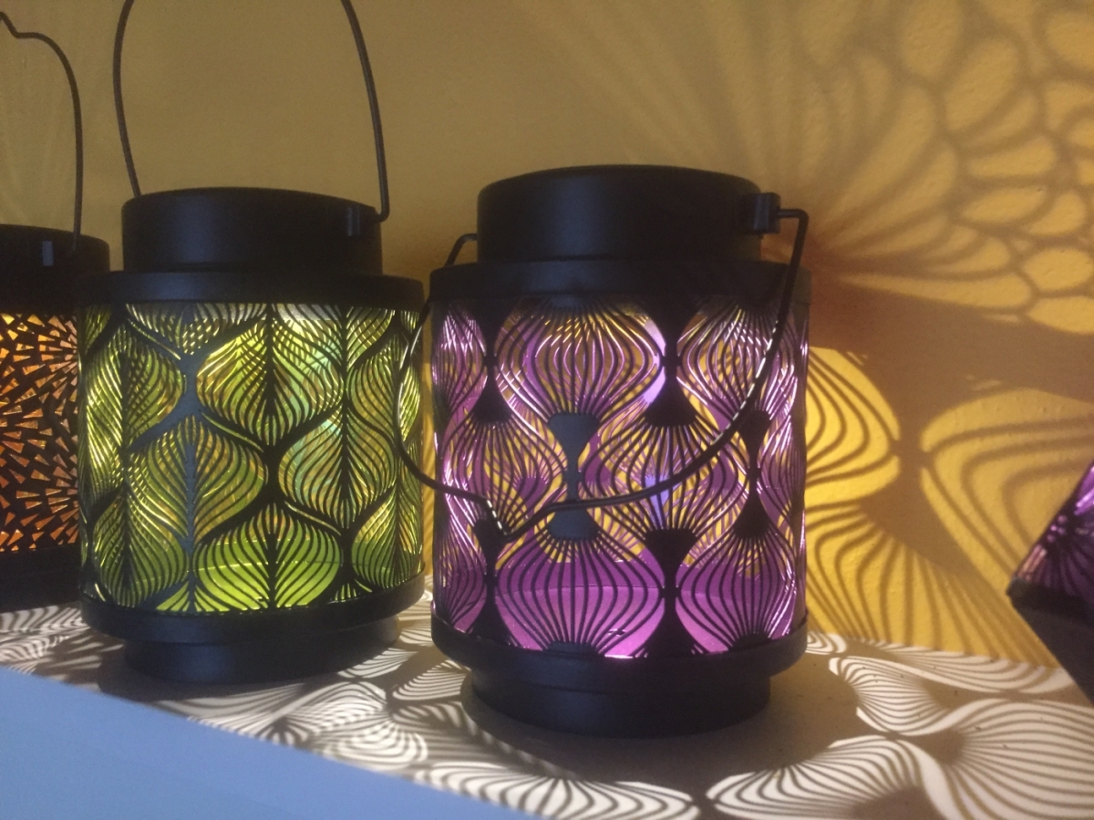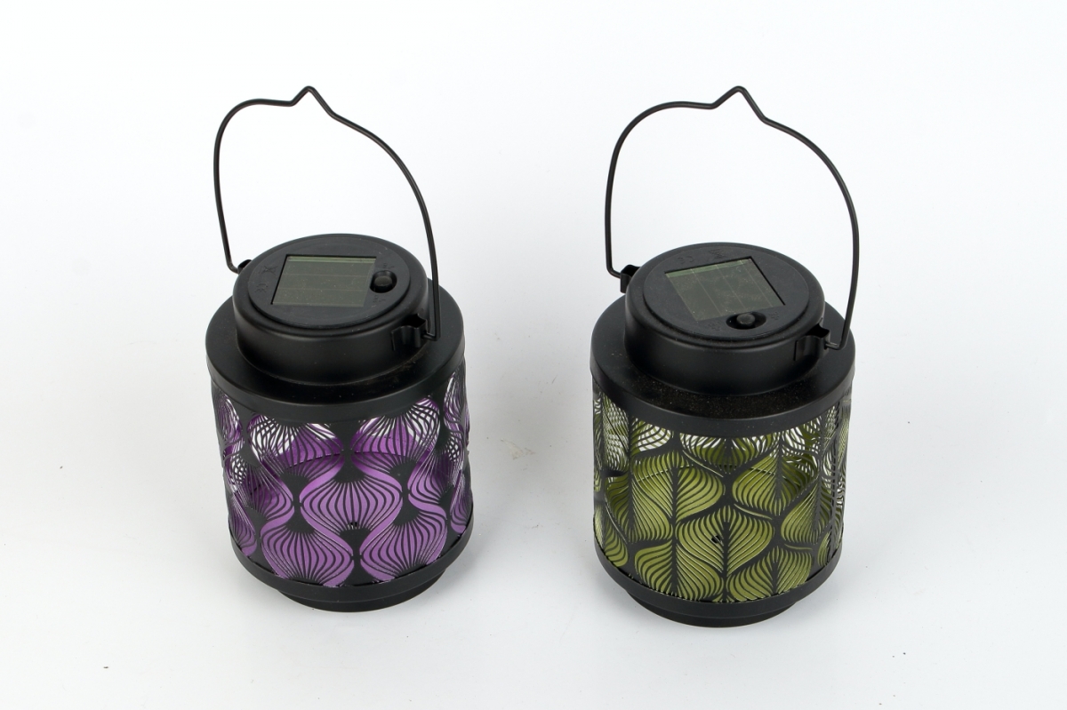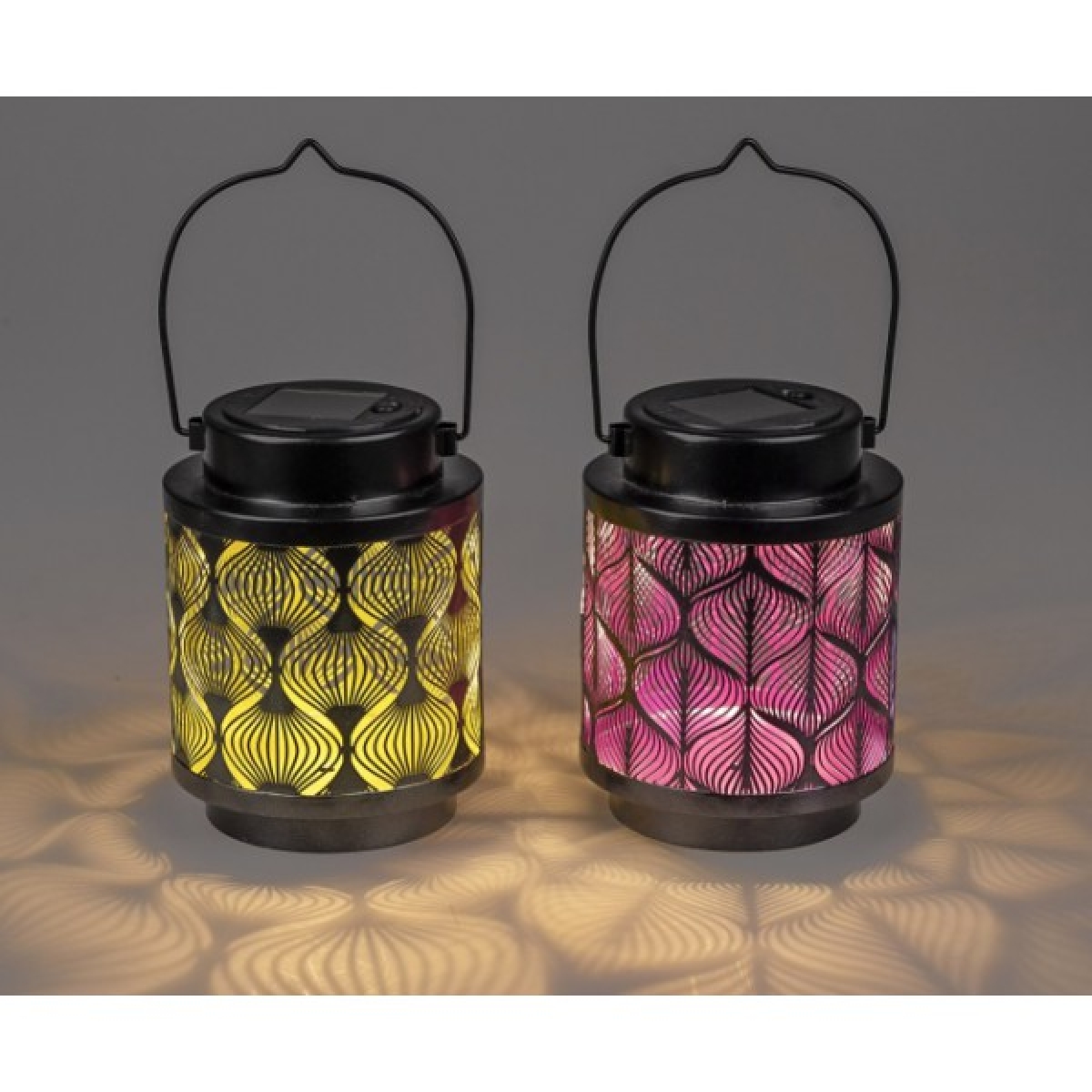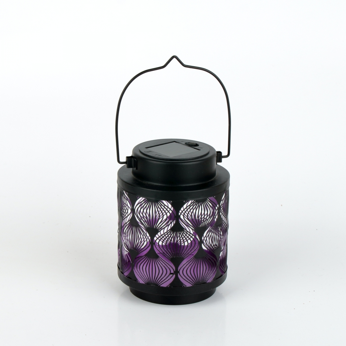 Solárna lampáš má vnútorné steny zafarbené do odtieňa ružovo-fialová a preto svetlo z lucerny vytvára práve tento odtieň.