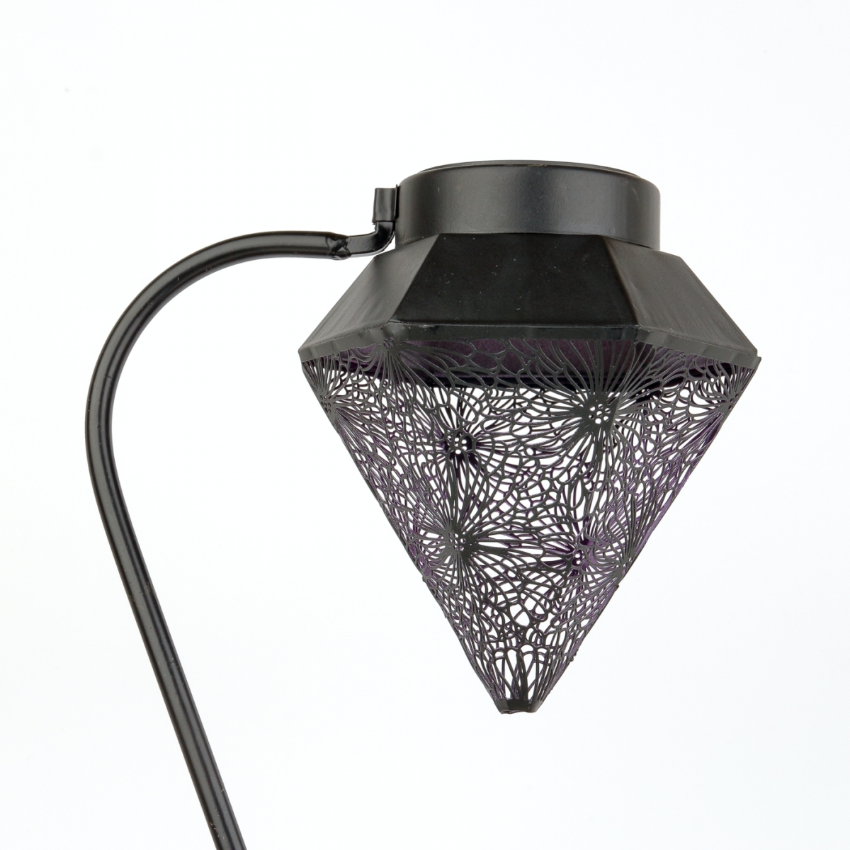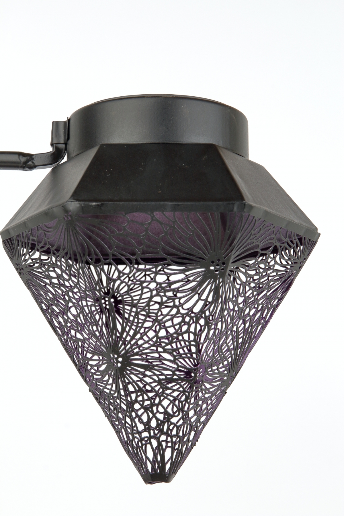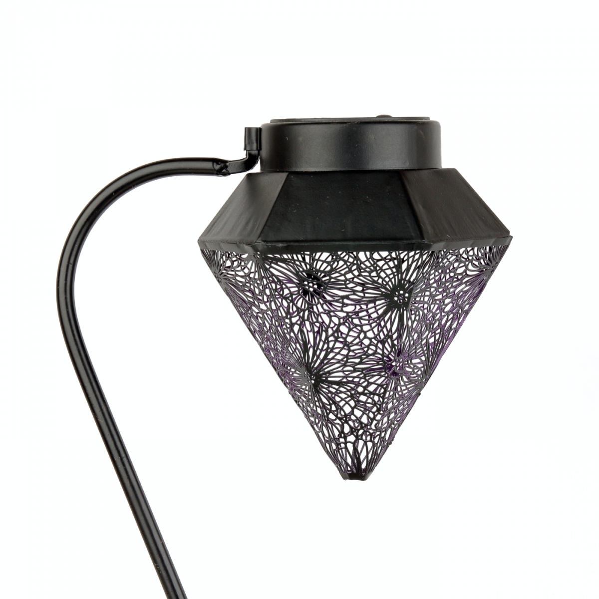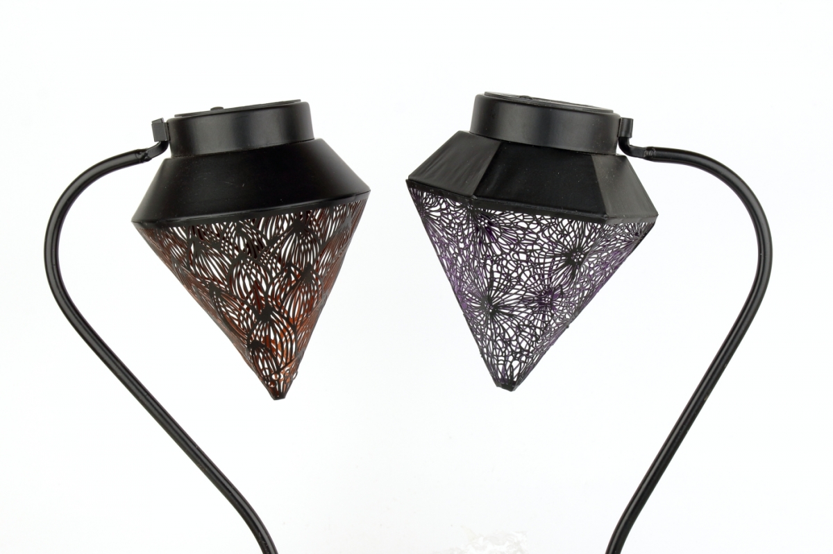 Solárny záhradný lampáš so zápichom, s perforovaným kovovým plášťom s ornamentmi.