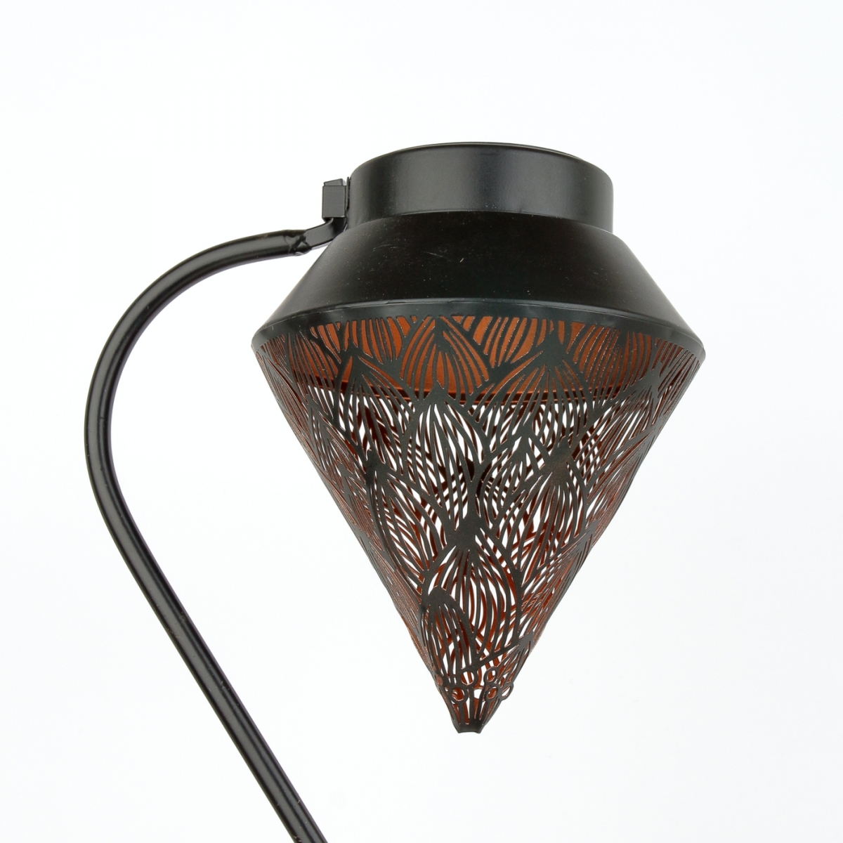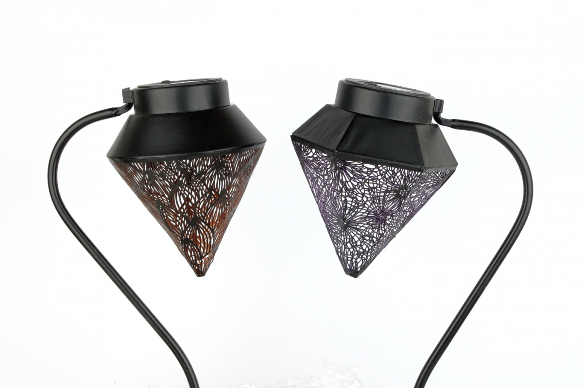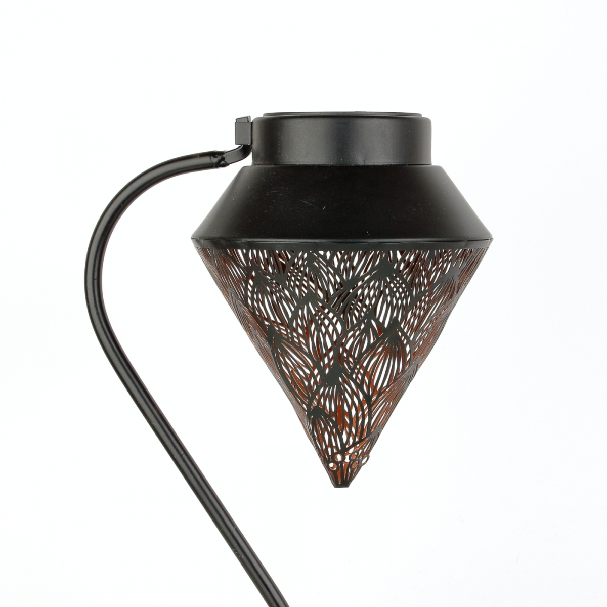 Solárny záhradný lampáš so zápichom, s perforovaným kovovým plášťom s ornamentmi.