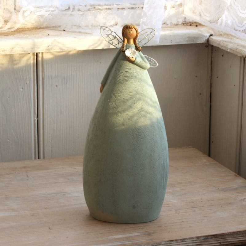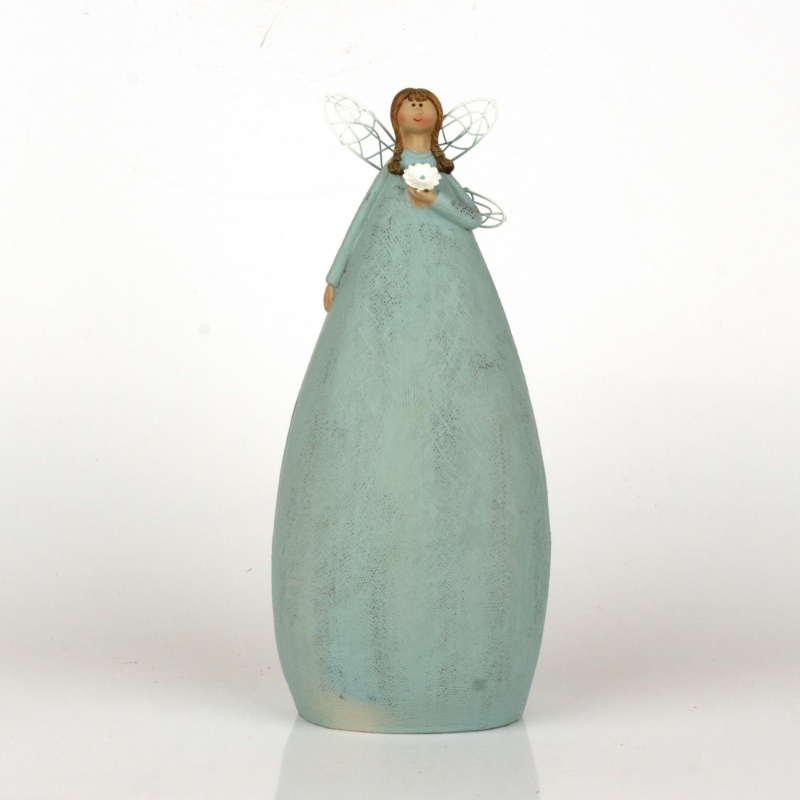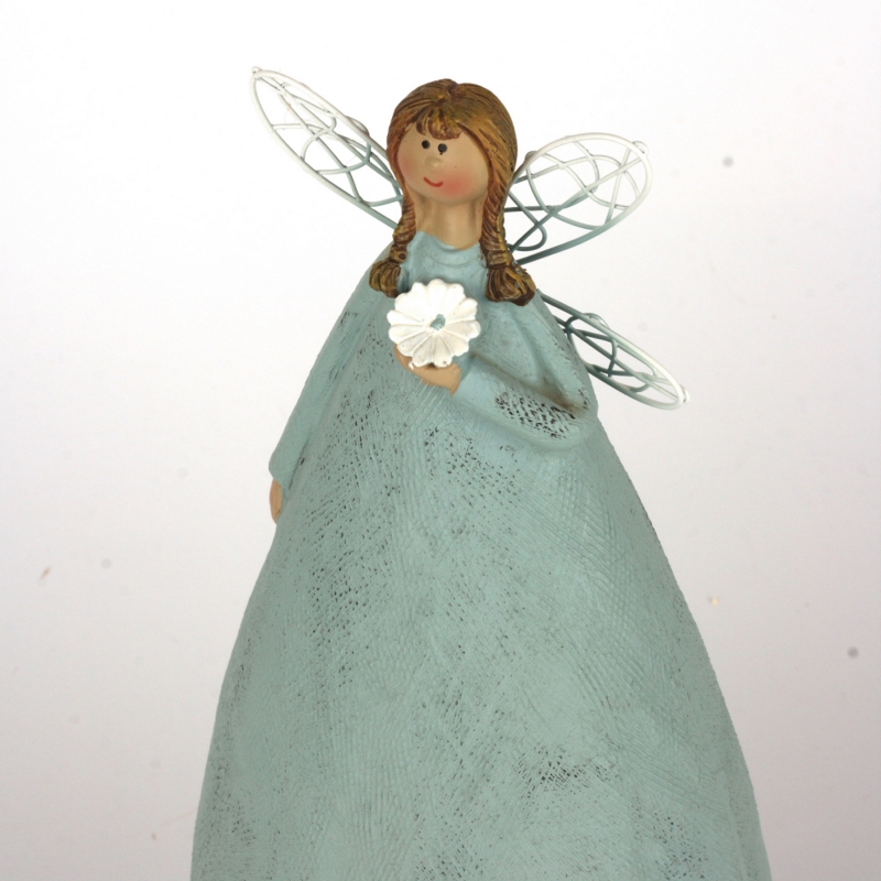 Anjel v dlhých modrých šatách s jemným leskom bude strážiť váš domov vo dne v noci. Drží v rukách kvetinu a patrí do kolekcie plné čarovných bytostí. V kategórii nájdete sošky v rovnakom dizajne v rôznych veľkostiach a farbách.