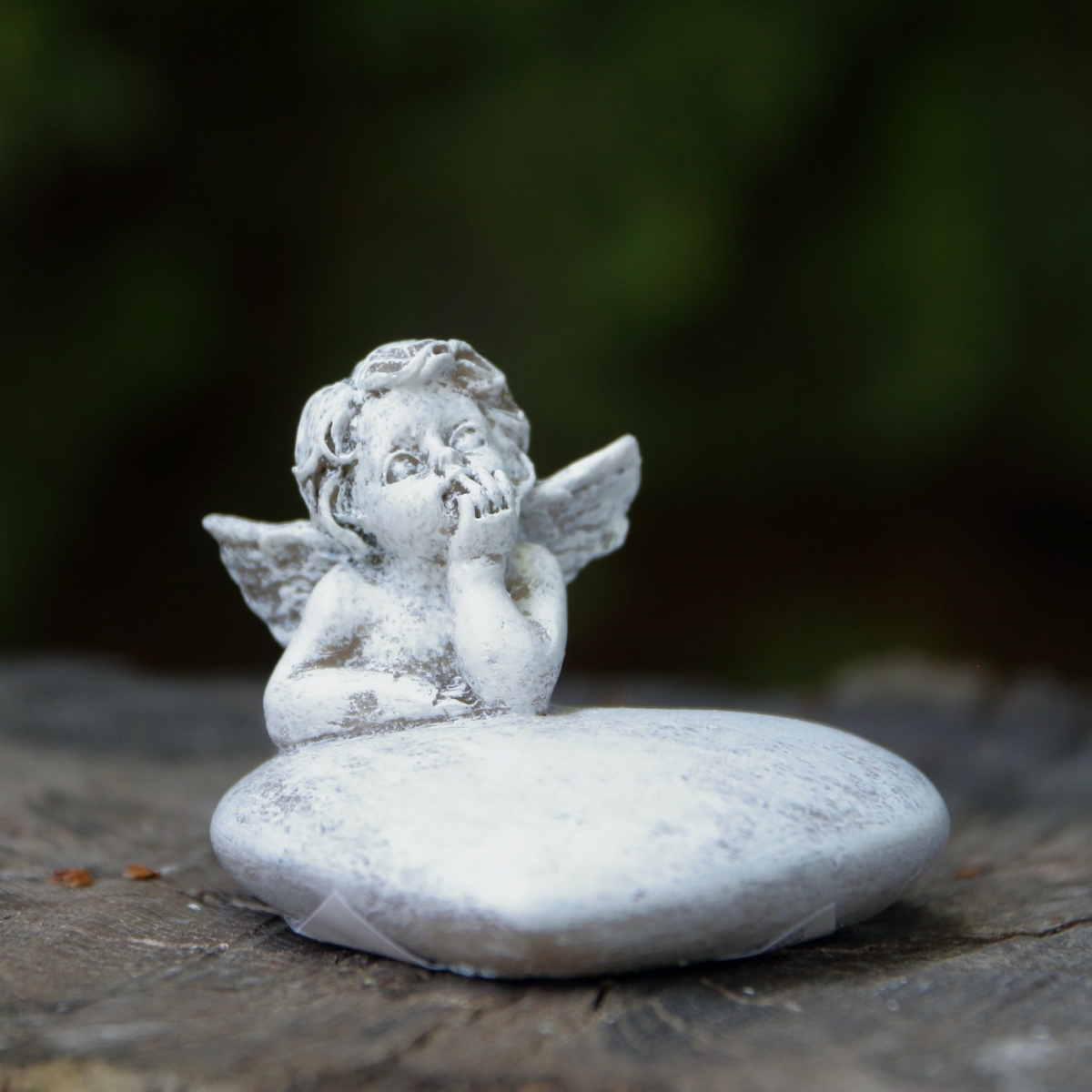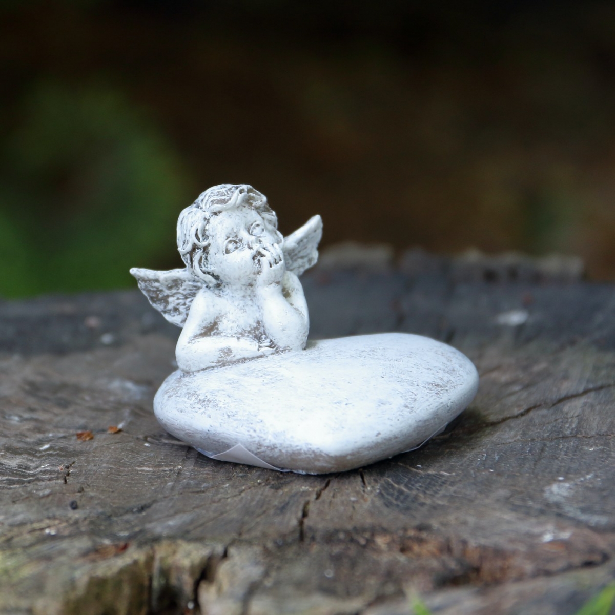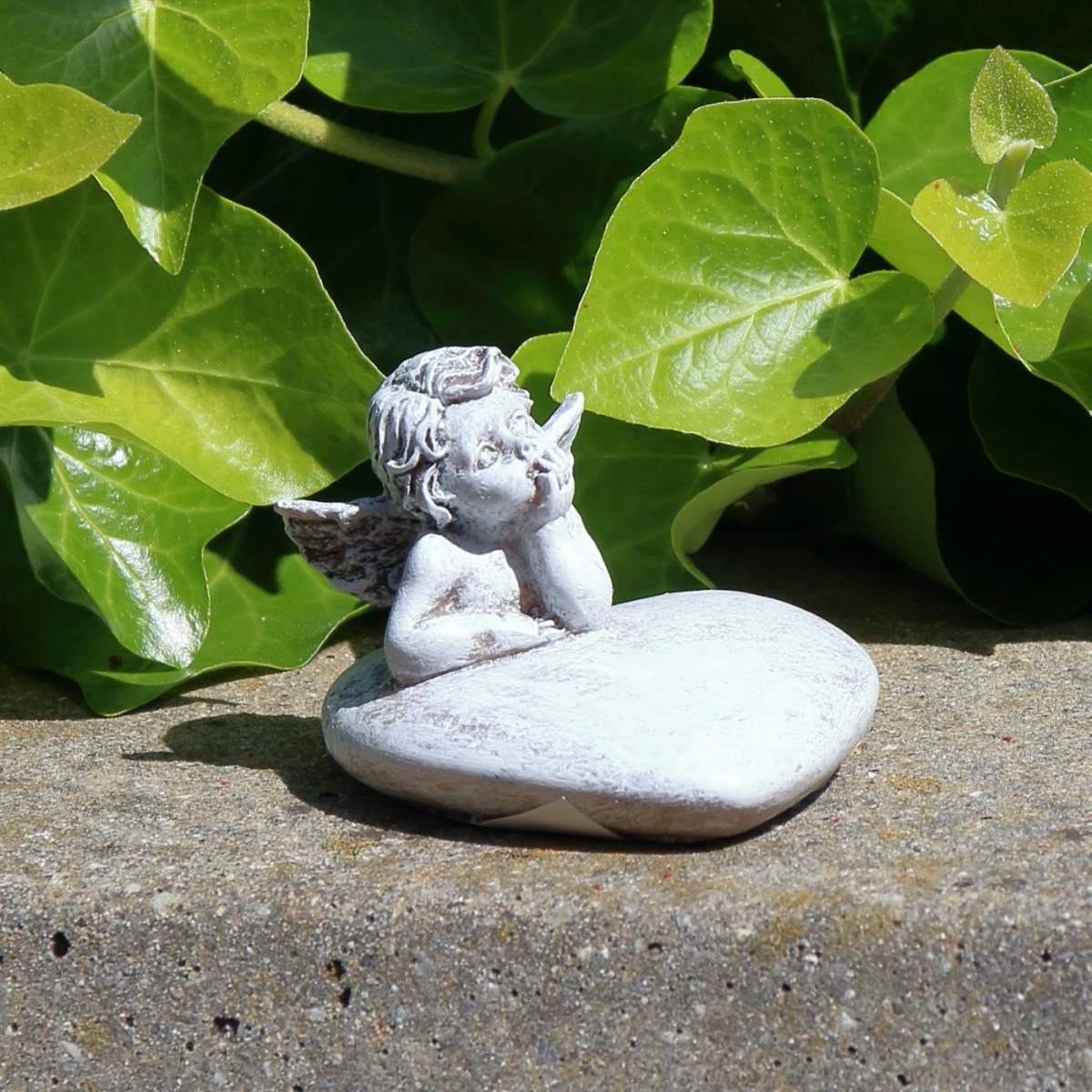 Soška anjela, ktorý odpočíva na srdiečku bude krásna u záhonu s vašimi obľúbenými kvetmi, doma na parapete alebo môže byť dôstojnou a krásnou cintorínske dekoráciou.