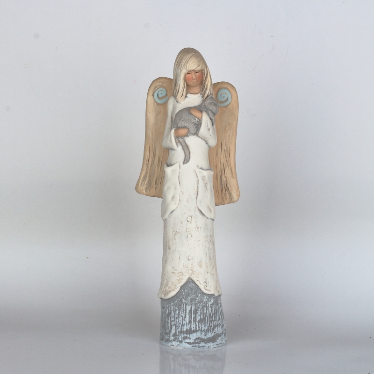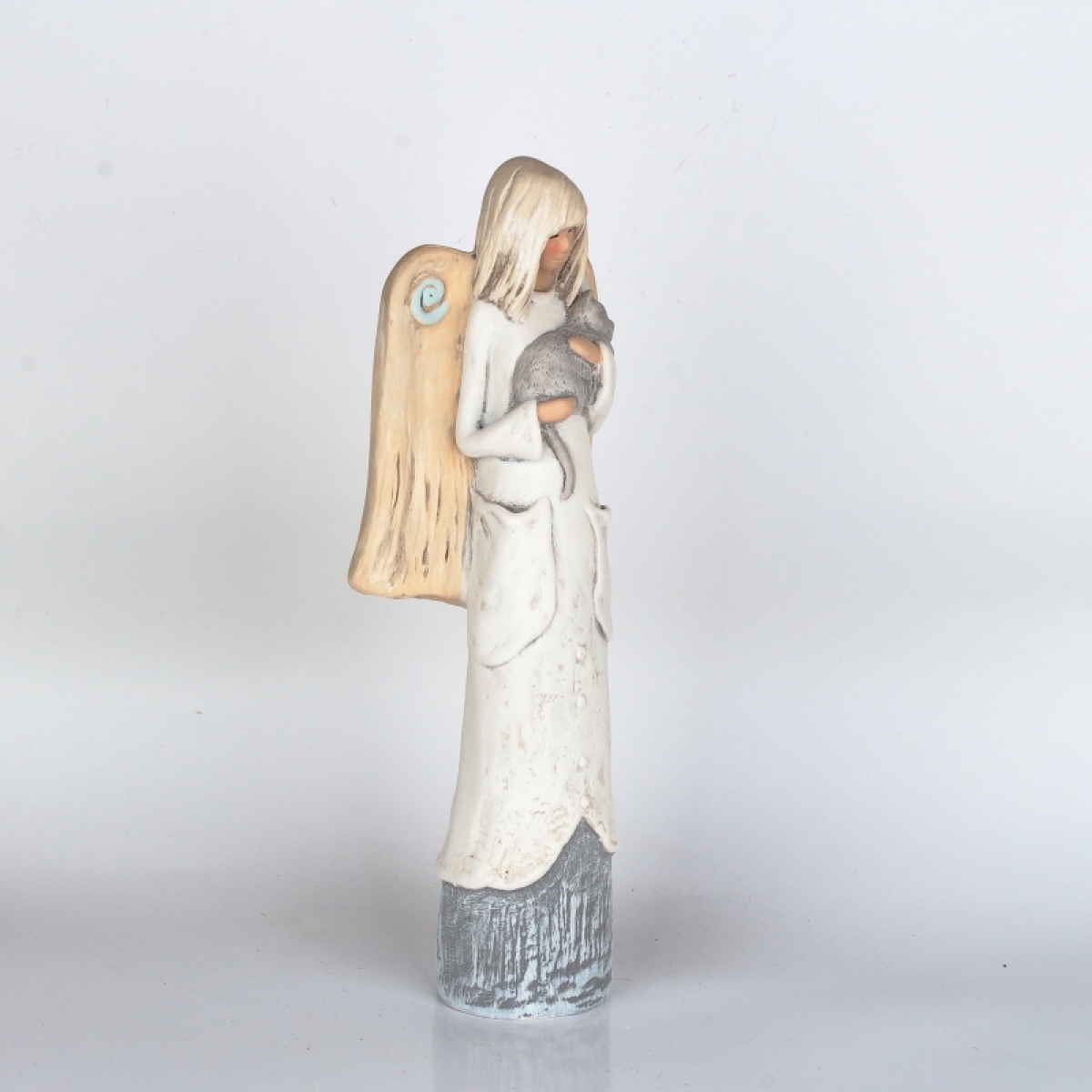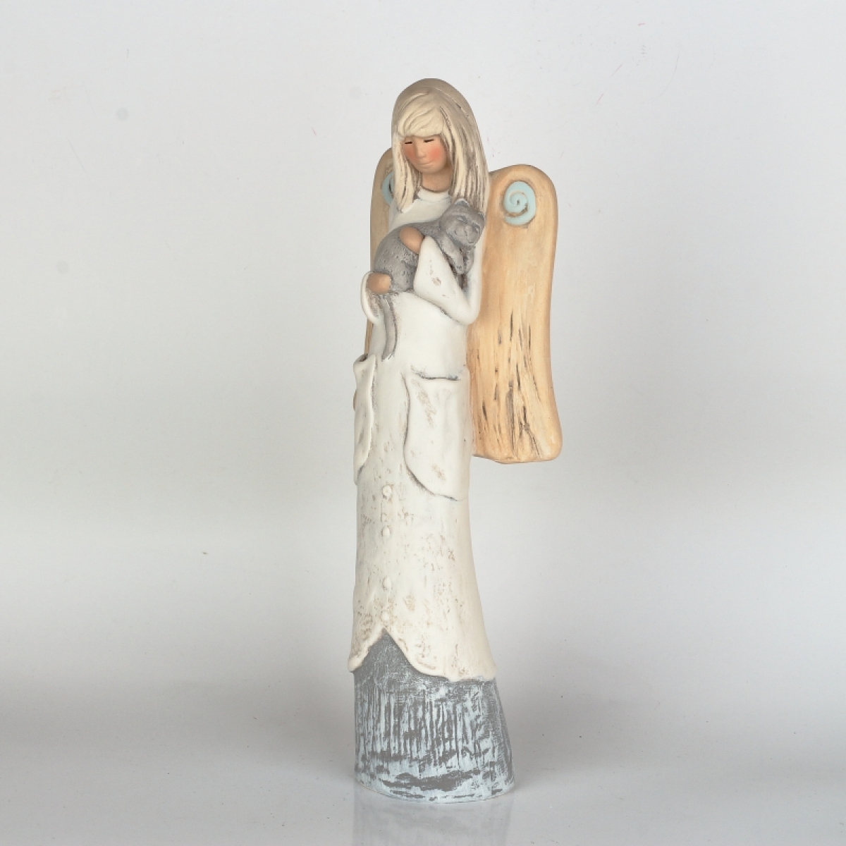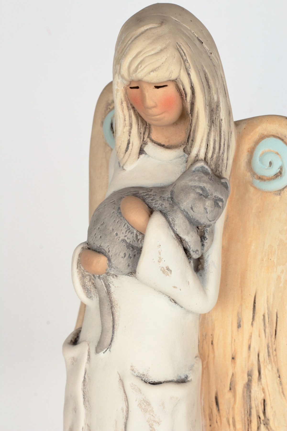 Soška anjela s mačkou je ručne odlievané z priemyselnej sadry, do silikónovej formy. Ručným maľovaním potom vzniká vždy nový originál.