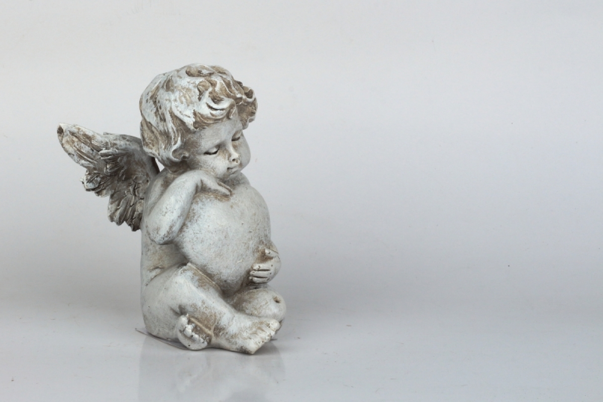 Soška anjela stvárňujúca nežnú postavu sa zvierajúcimi srdcom v lone.