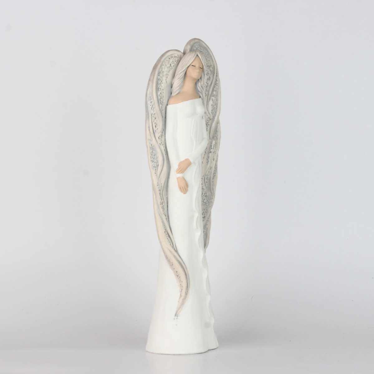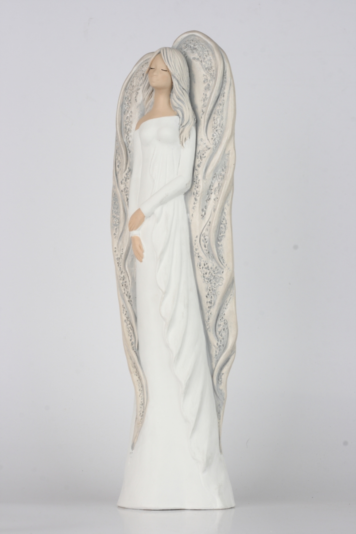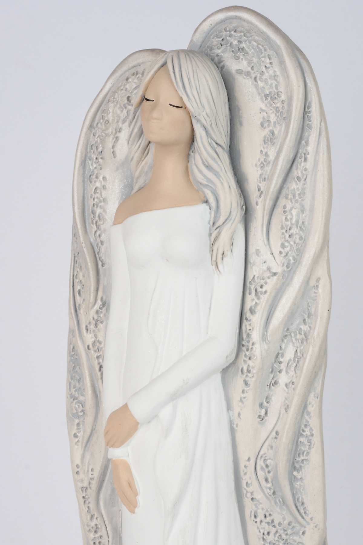 Postava anjela v bielych šatách s veľkými šedými krídlami, ktoré klesajú až k nohám.