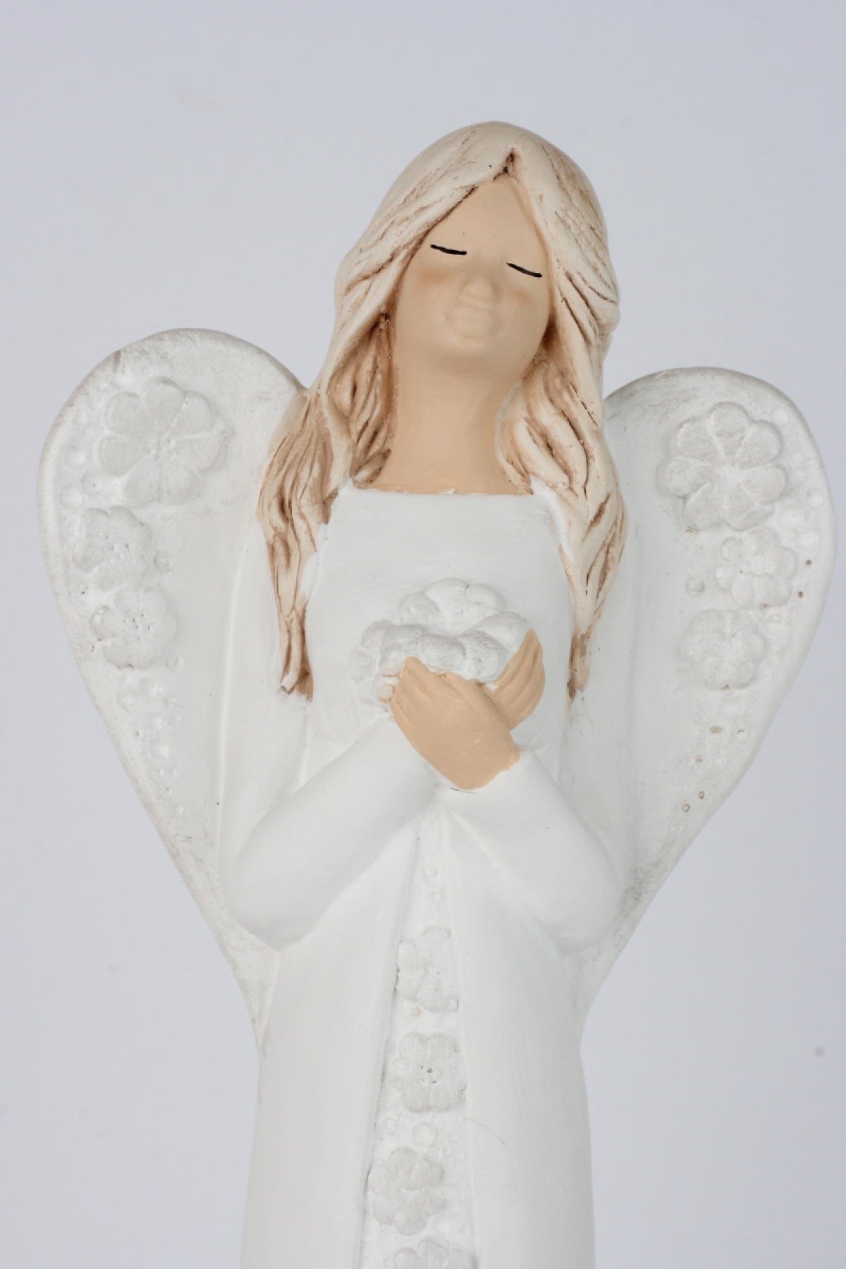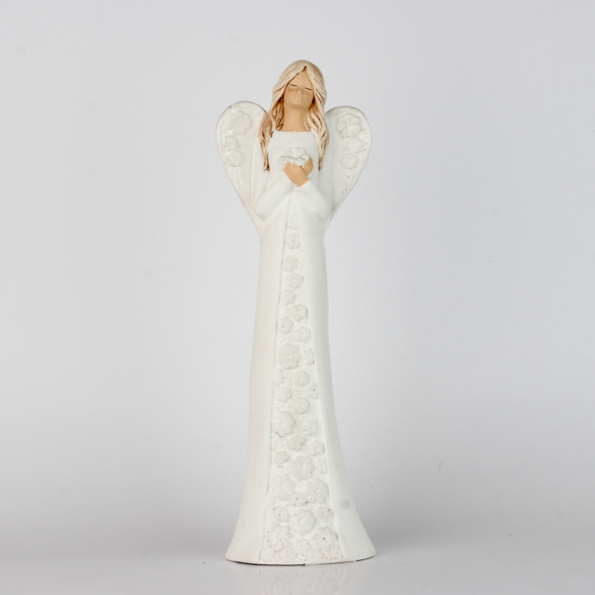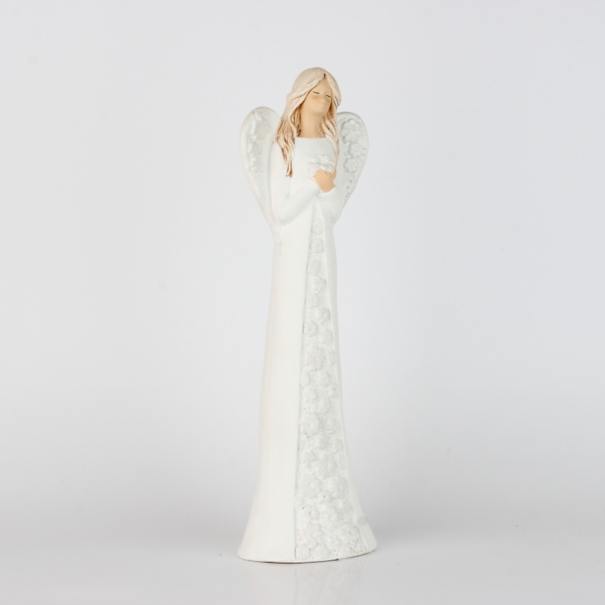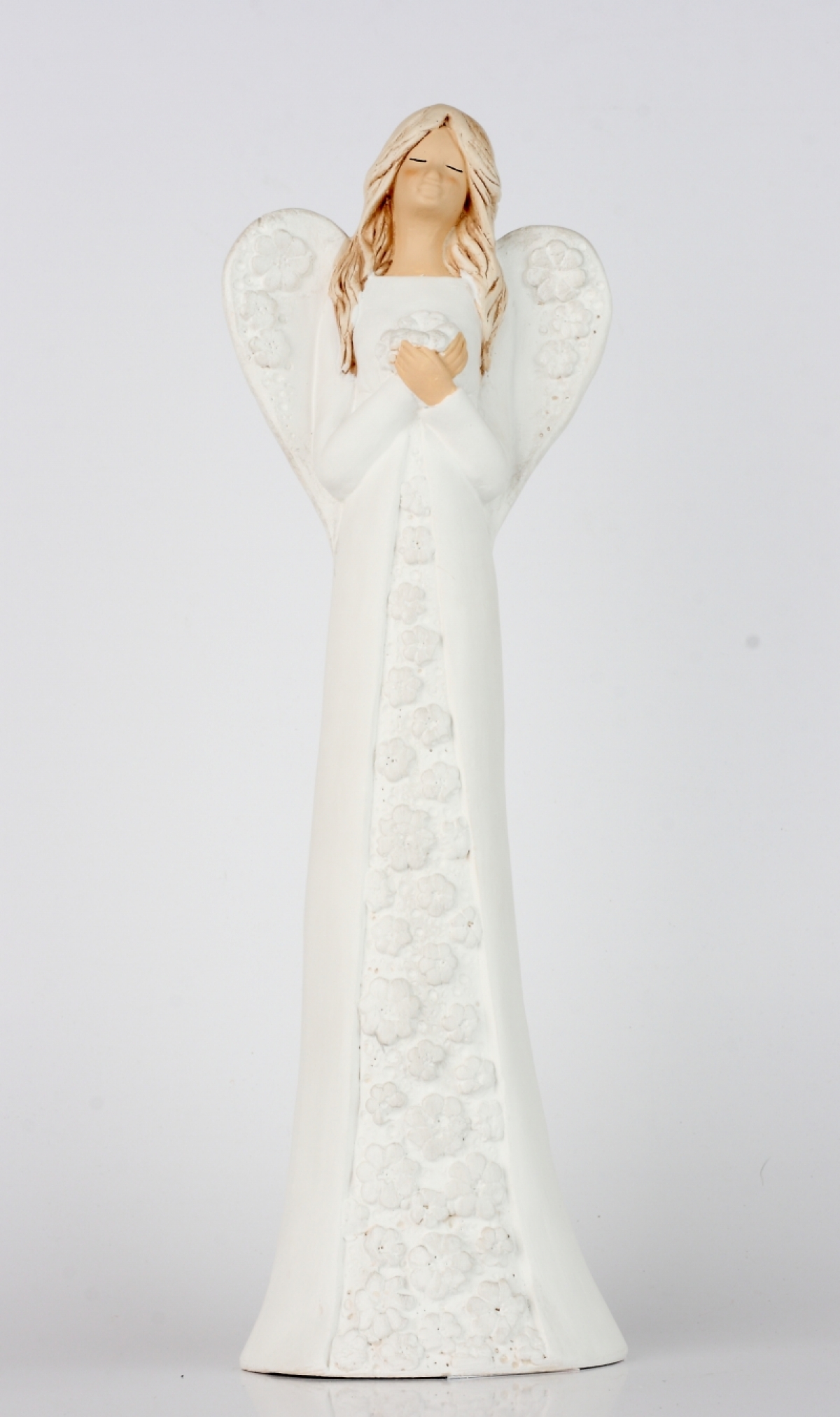 Soška sadrového anjela s bielymi kvetovanými šaty 37cm