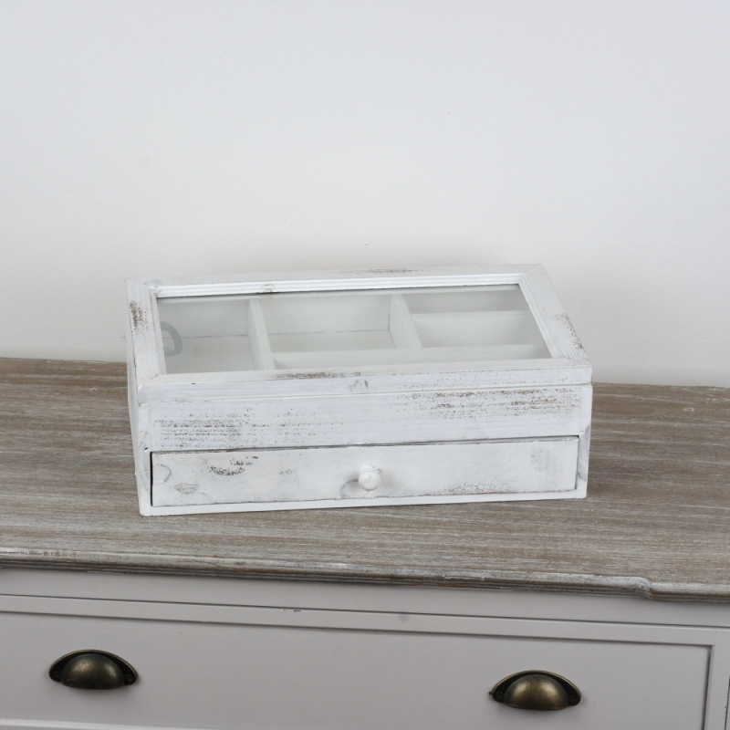 Šperkovnica má presklenné horné veko, cez ktoré je vidieť do malých priehradiek. V spodnej časti je šuflíček, do ktorého sa zmestí veľa drobností.