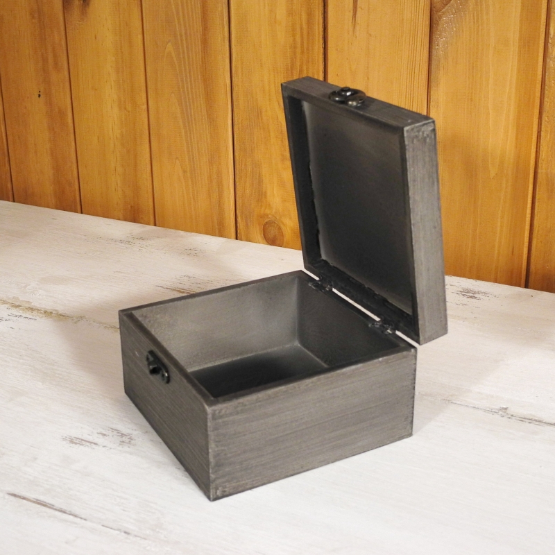 Truhlička má kovový patent, ktorým sa uzatvára. Jej náter necháva vyniknúť štruktúru dreva.