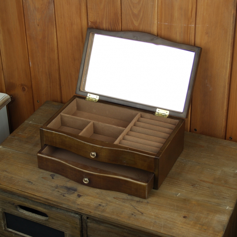 Drevená šperkovnica s rozmermi 28 x 16cm s výškou 10cm má navyše cez celý vrchný odklápacie diel zrkadlo. Môžete sa teda u šperkovnice hneď ustrojiť a skontrolovať, či je všetko tak, ako má byť.