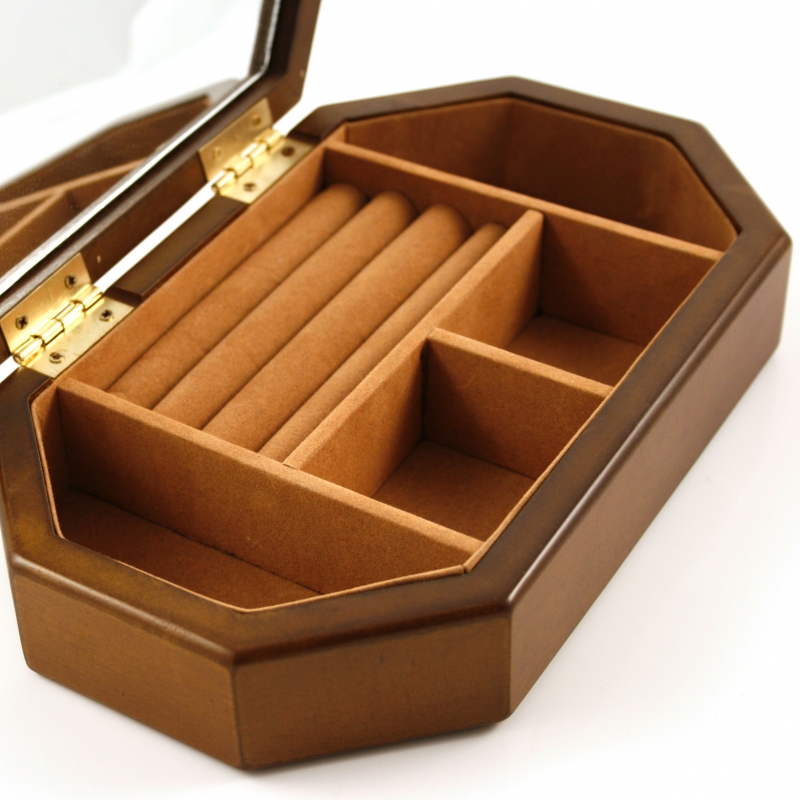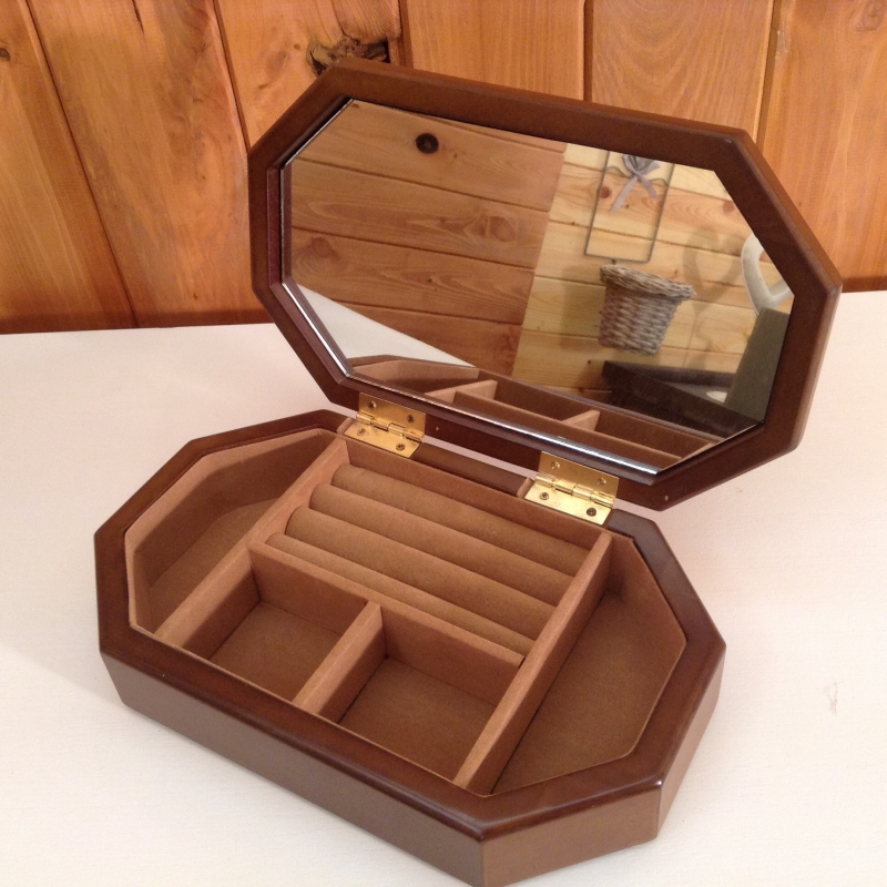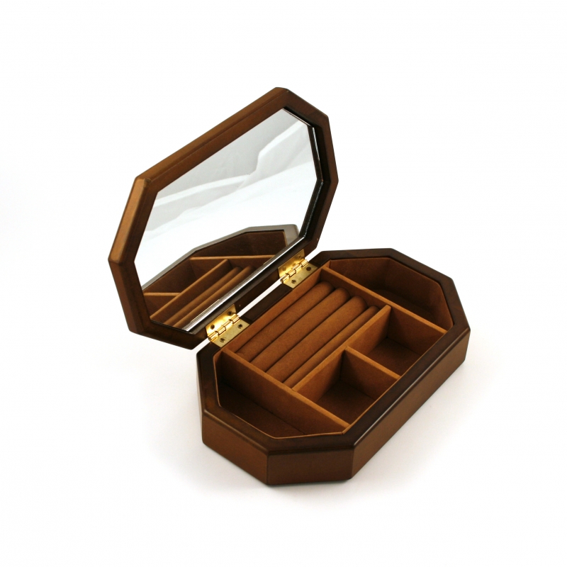 Šperkovnica, ktorú vidíte na obrázku , má rozmer 25 x 16 x 6 cm . Je vyrobená z dreva a má tvar osemuholníka . Horní víko šperkovnice je opatřeno zrcadlem, takže se ihned můžete podívat, jak Vám zvolený šperk sluší.