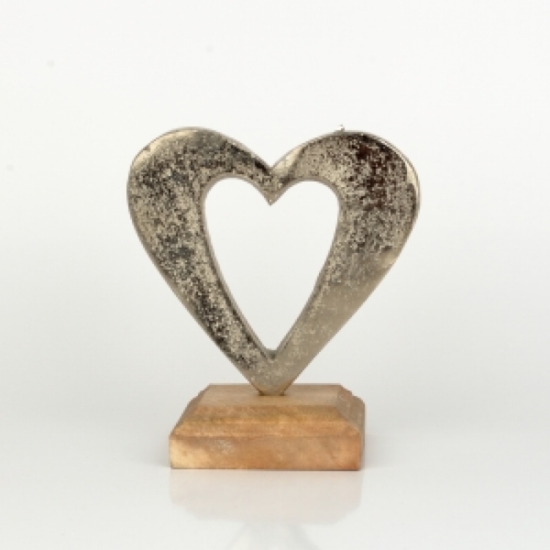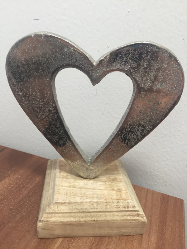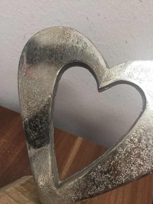 Srdce inspirované láskou je vyrobeno z hliníku a vsazeno do ručně vyřezávané podesty z akátového dřeva. Je vyřazené z důvodu tmavých fleků na hliníku. Když se srdíčko dobře natočí proti světlu, tak poškození nepůjde vidět.