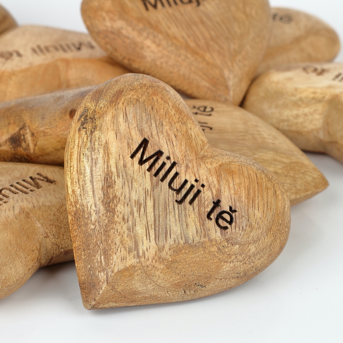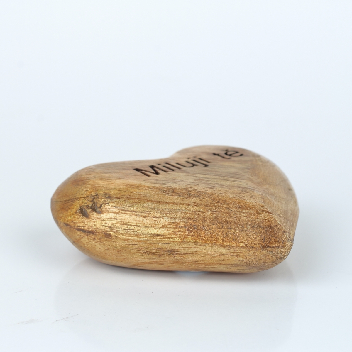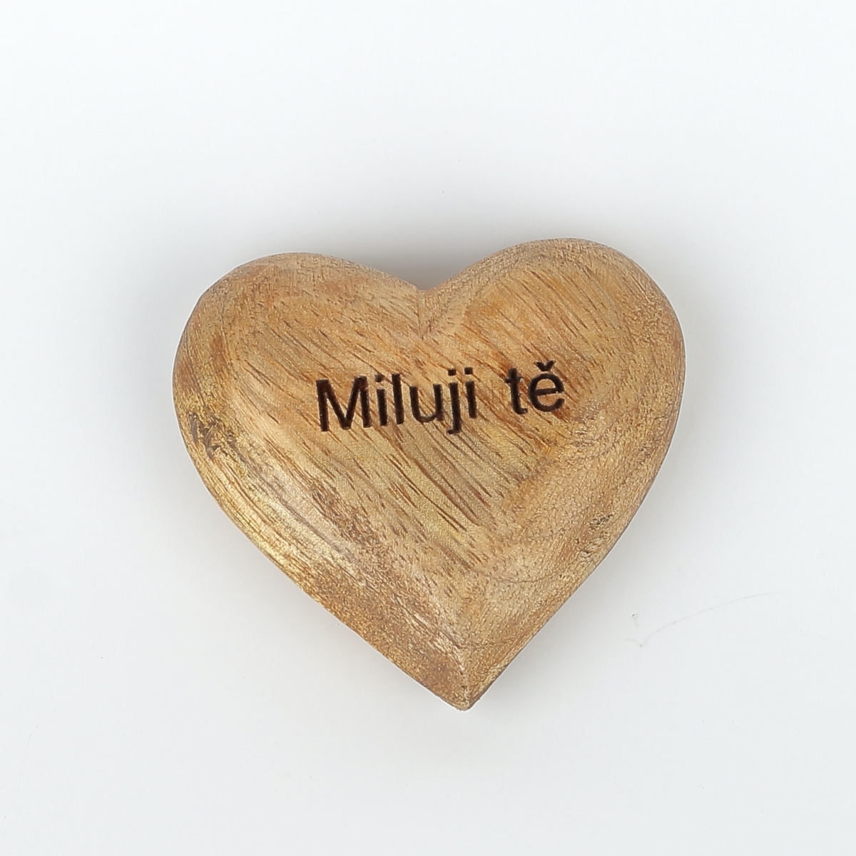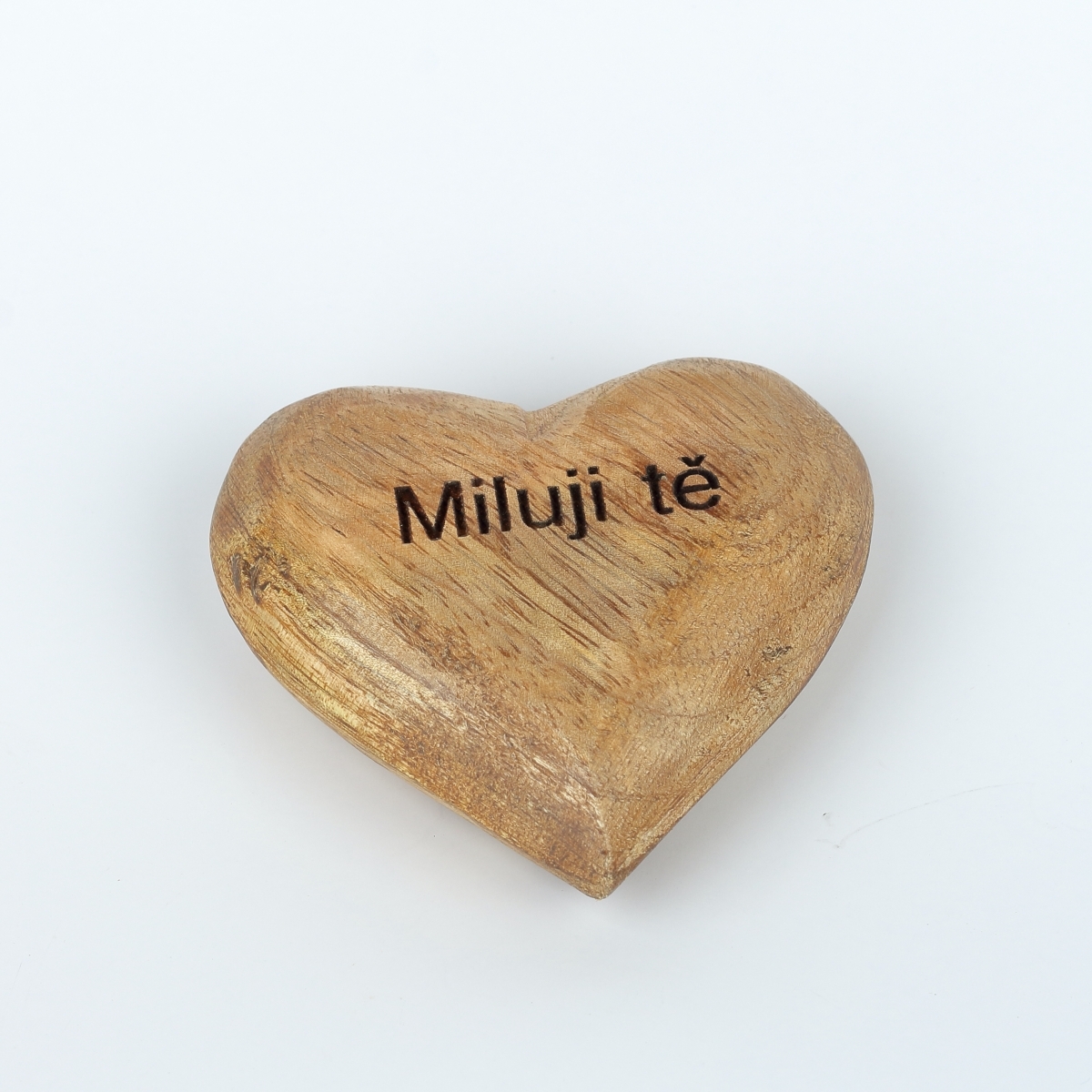Srdce z lásky ručne vyrezávané z mangového dreva, s gravírovaným nápisom Miluji tě!