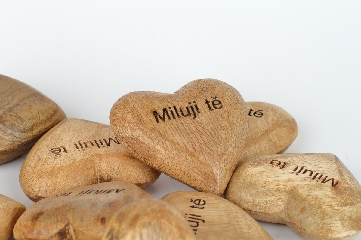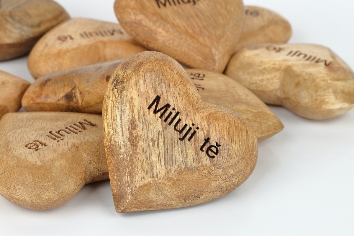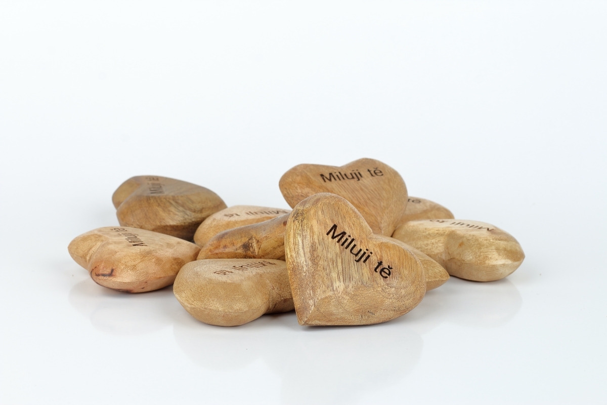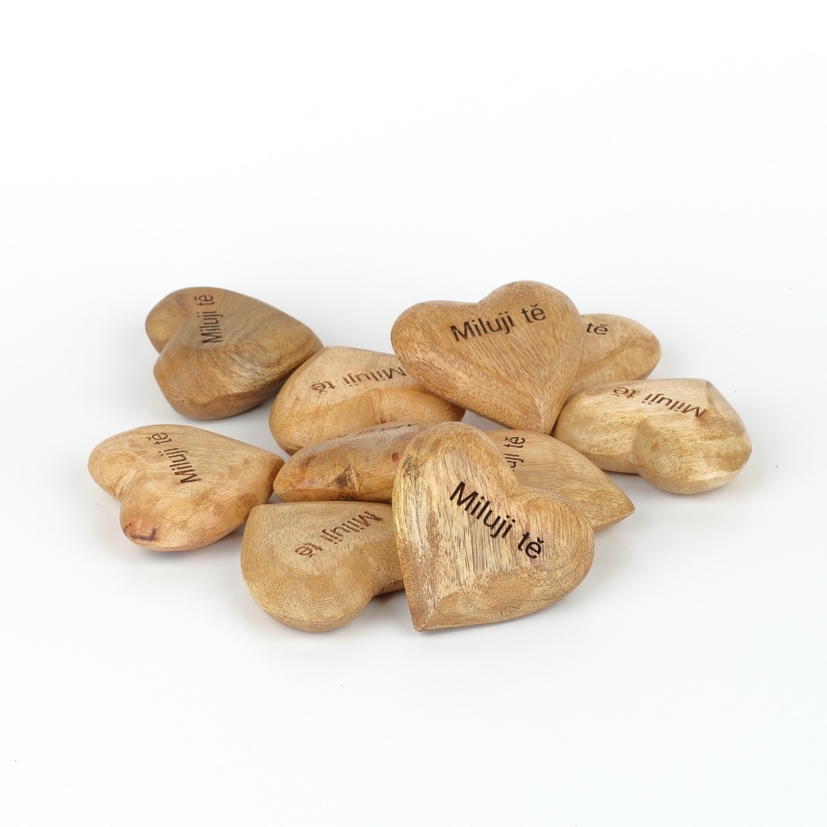 Srdce z lásky ručne vyrezávané z mangového dreva, s gravírovaným nápisom Miluji tě!