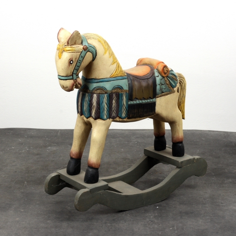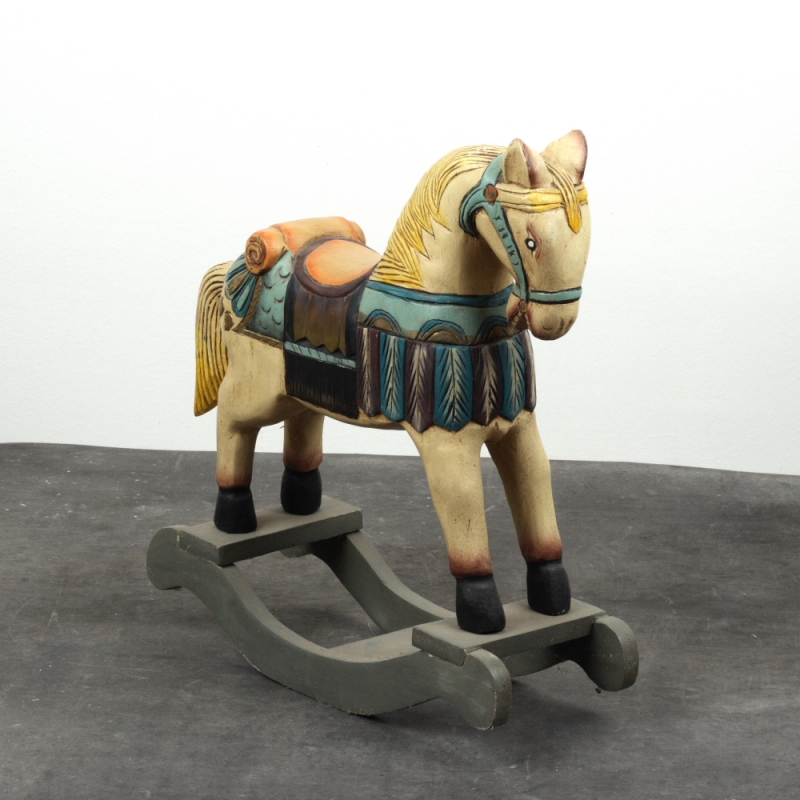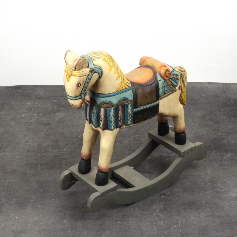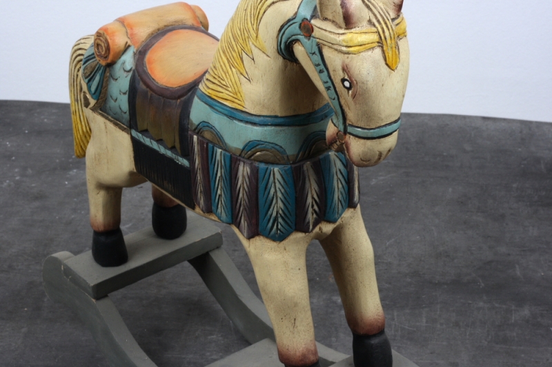 Starožitný drevený hojdací kôň 47cm je vyrezávaný a ručne maľovaný. Jedná o jedinečný kúsok do zbierky pre milovníkov vintage dekorácií.