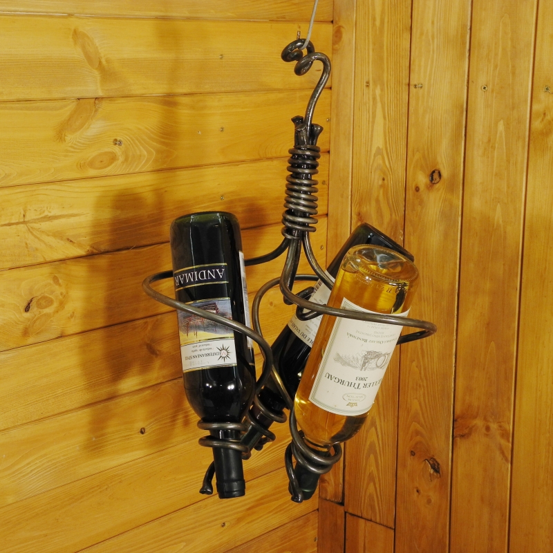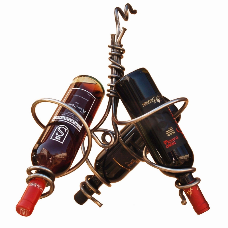 Stojan na 3 fľaše vína je určený pre všetkých s fantáziou a zmyslom pre hru. Nie je to totiž len tak obyčajný statický držiak. Tento môže meniť svoju podobu podľa vášho želania - jednotlivé časti je možné spájať a rozpájať apod. Držiak je vysoký asi 40 cm, rovnaký bude aj priemer držiaka s už zavesenými fľašami. Kvalitný pomocník na uchytenie fliaš, ktorý vám možno pripomína zaujímavý luster či kvetinu, je vyrobený z oceľovej guľatiny určené na zavesenie.