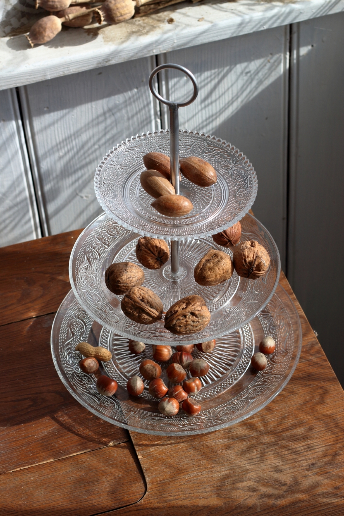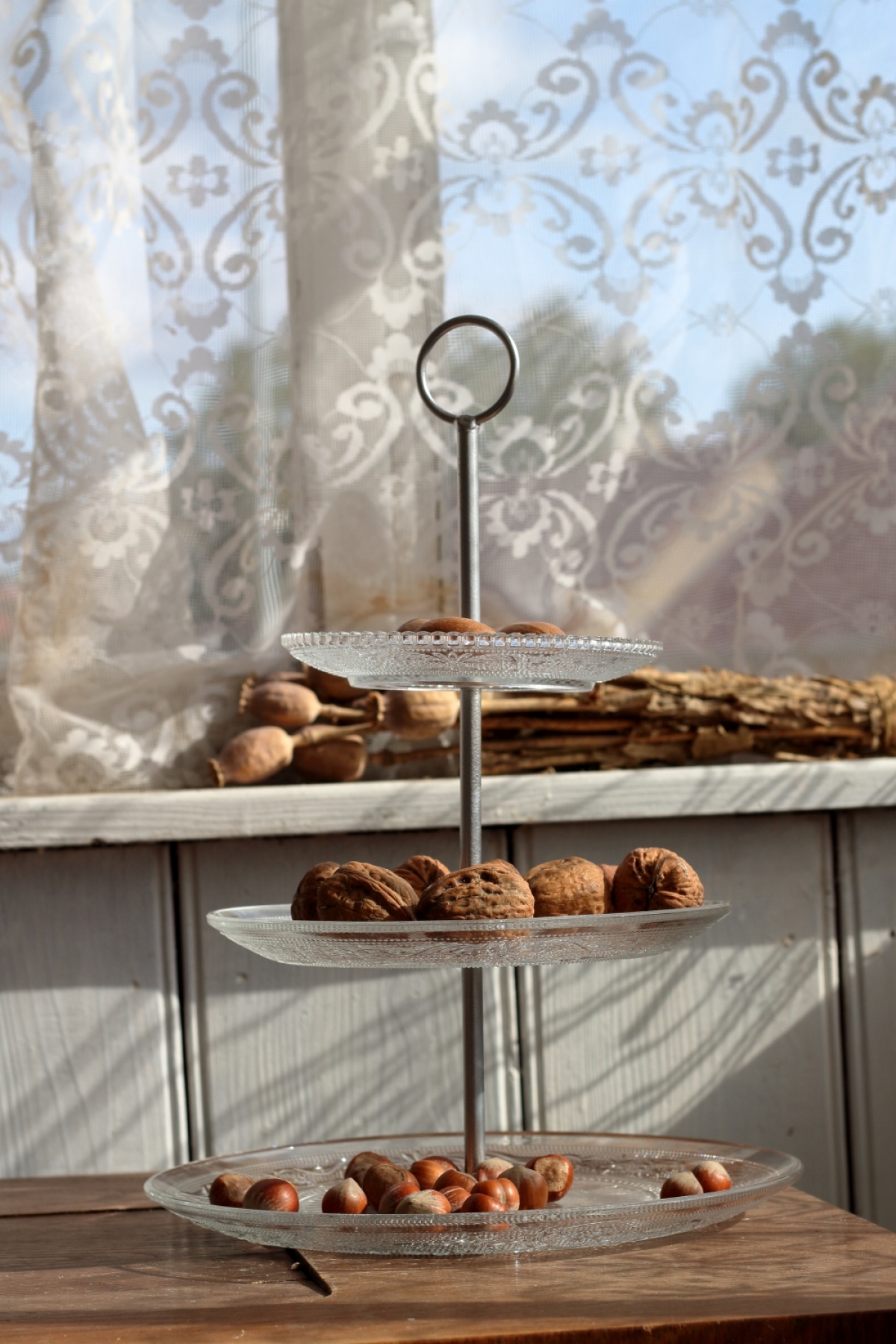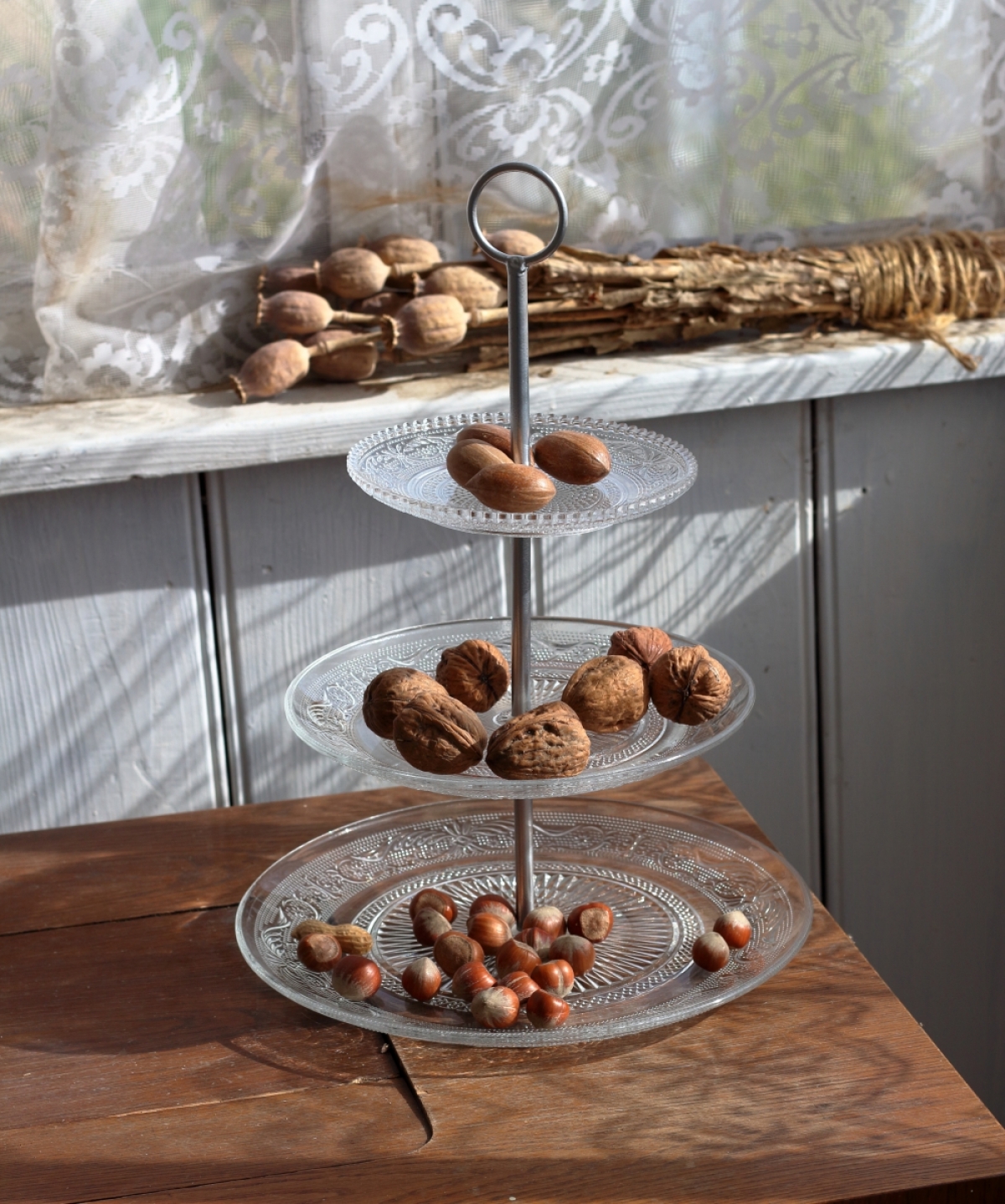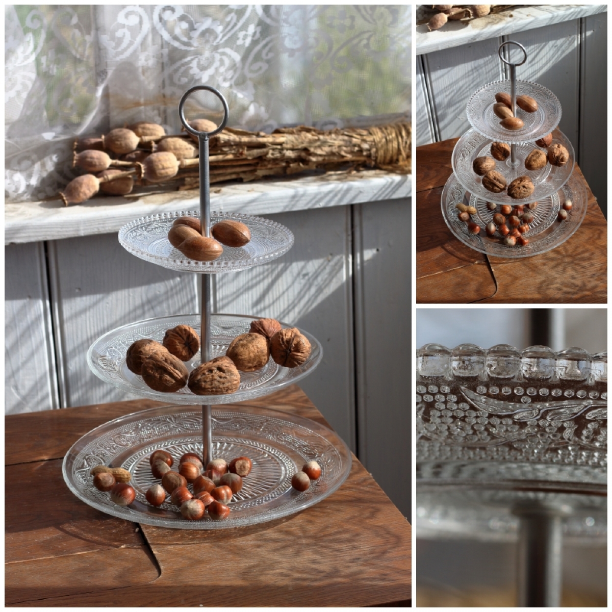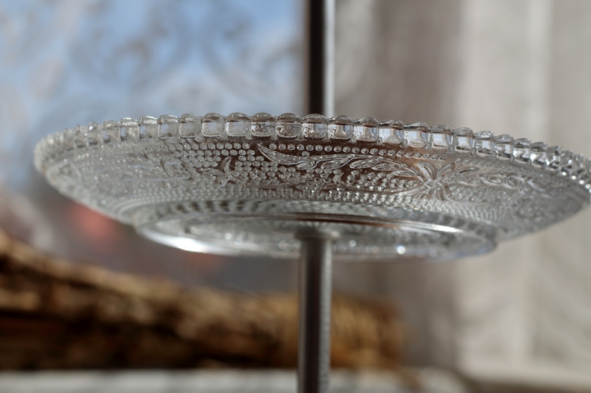 3 sklenené tanieriky prepojené kovovou nôžkou s úchytom v hornej časti.