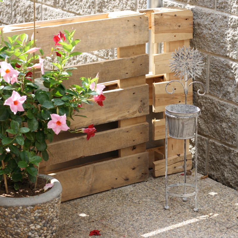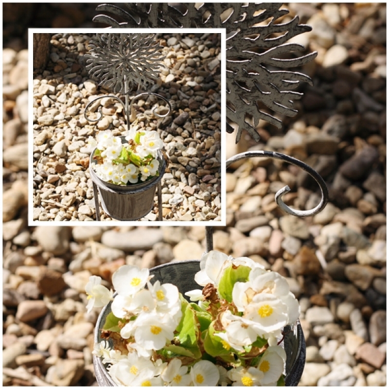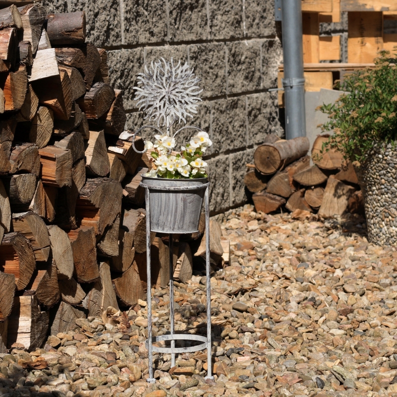 Kvetináč je umiestnený v kovovej obruči na nožičkách, nad kvetináčom sa pne kovová kvetina.