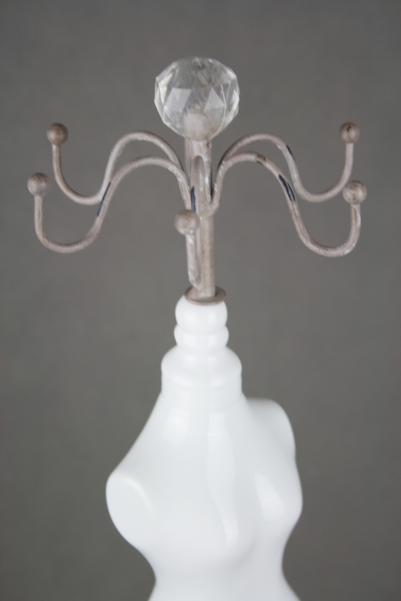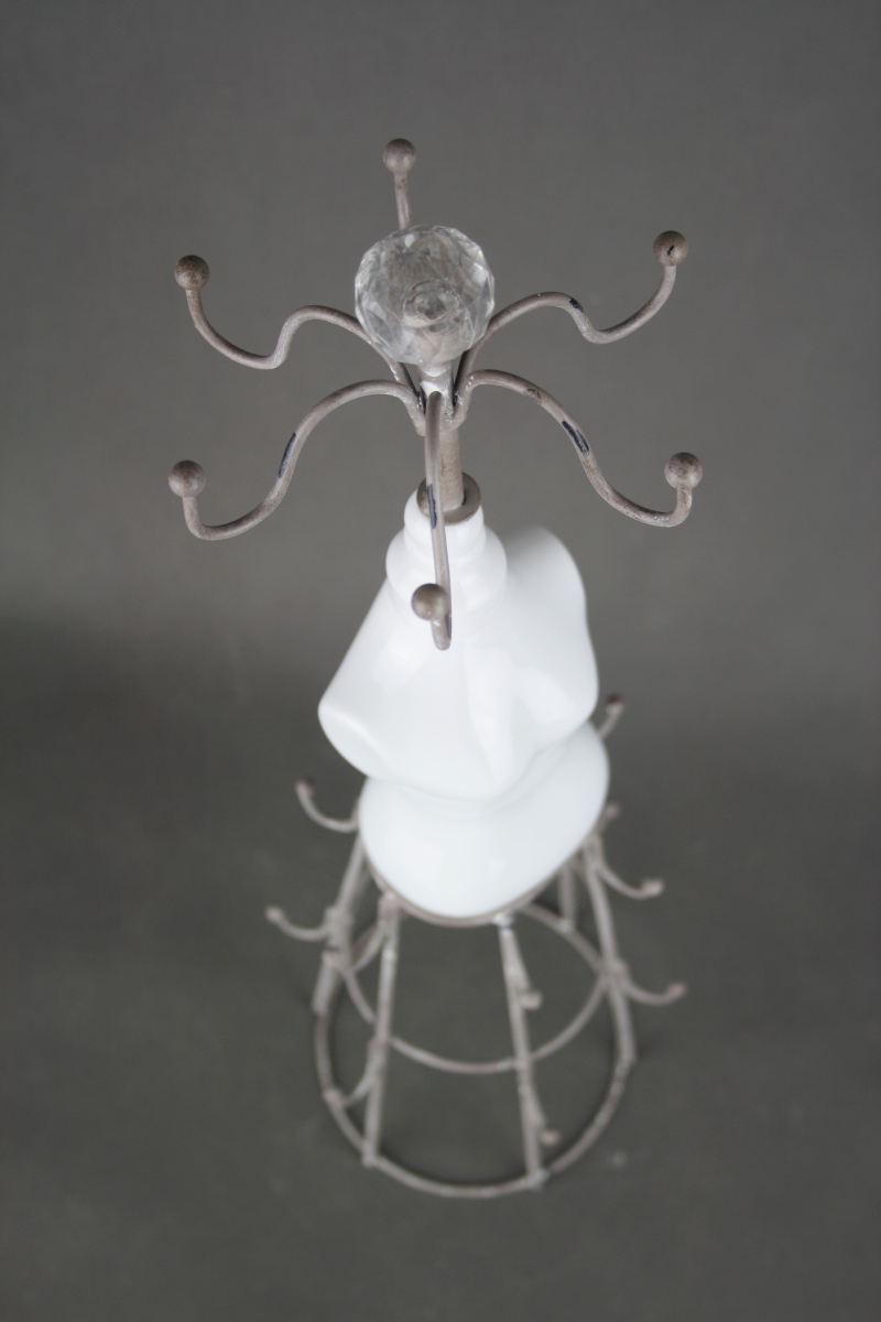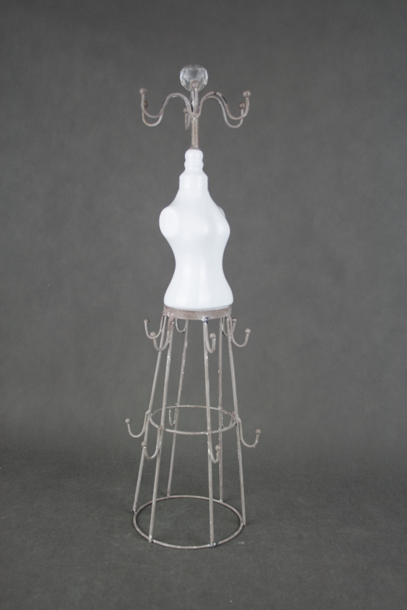 Stojan má kovovú konštrukciu, unesie tak všetky Vaše poklady a nemusíte sa báť, že by sa prevrátil. Vrchná časť tvorí keramické telo figuríny a hore zdobia stojan brúsený číry kameň.