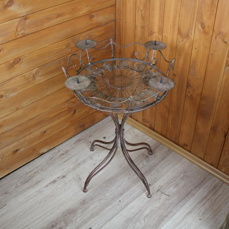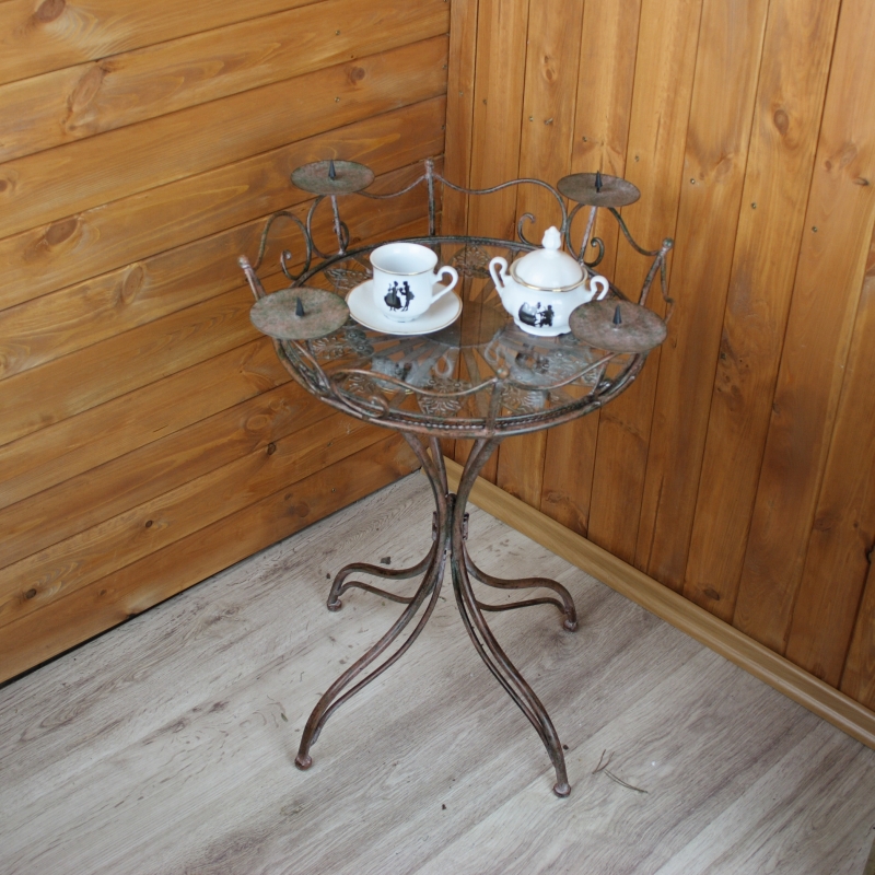 Stôl so sklenenou doskou a odnímateľným svietnikom. Nádherný kovový stôl s patinou okrúhleho tvaru, ktorý má nádherne zdobenú spodnou časťou odkladacie plochy.