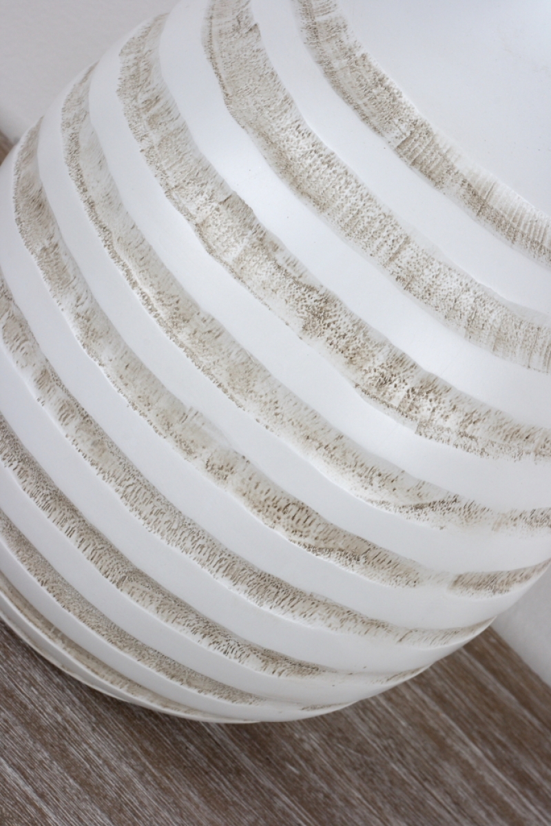Stolná lampa má netradičné podstavec v tvare gule zdobený rytím v tvare připomínajím vodný vír. Tienidlo má krémovú farbu s jemným melírom. V rovnakom dizajne podstavca ako má lampa nájdete v ponuke tiež dekoračné vázy alebo svietniky, ktoré spoločne tvoria krásnu ucelenú kolekciu bytových doplnkov.