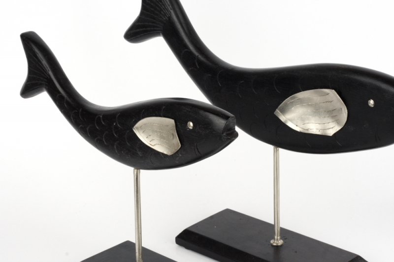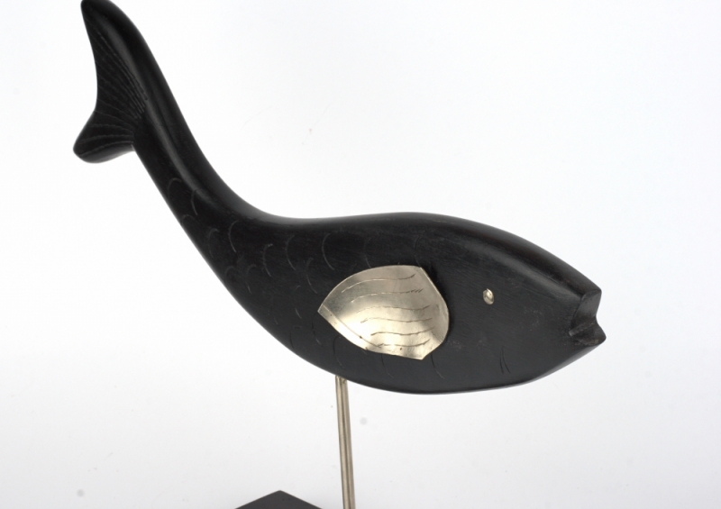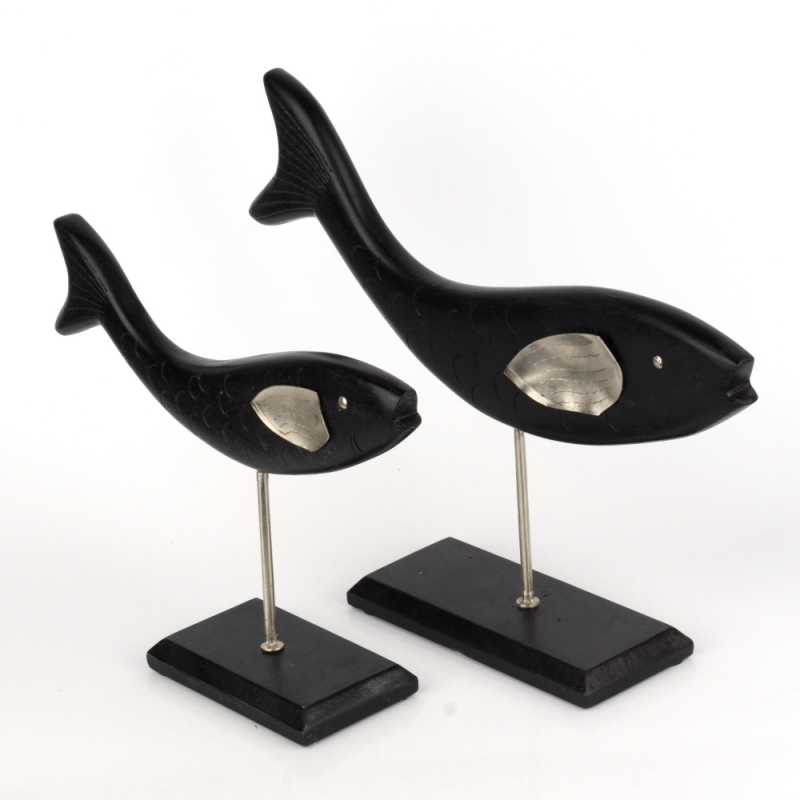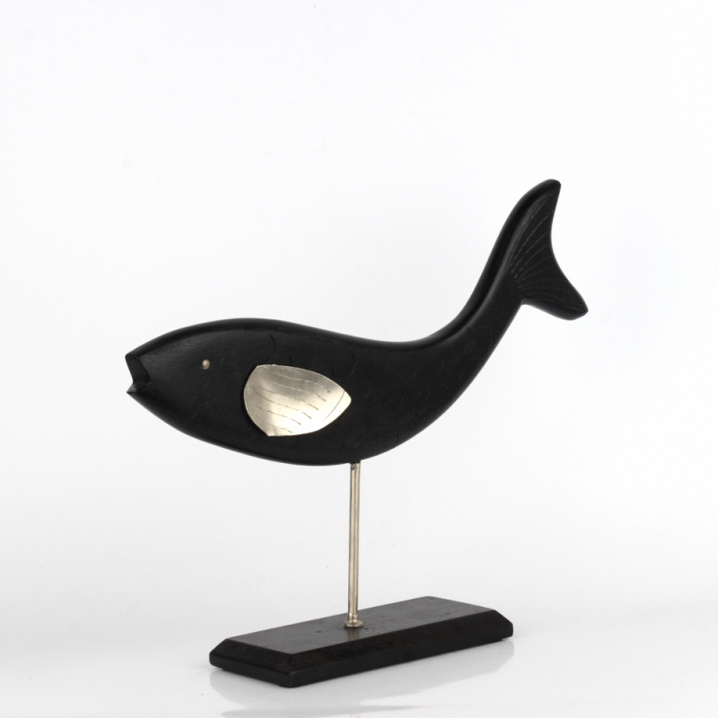Drevená ryba je vsadená do podstavca rovnakej farby. Ryba má kovové oko a plutva.
