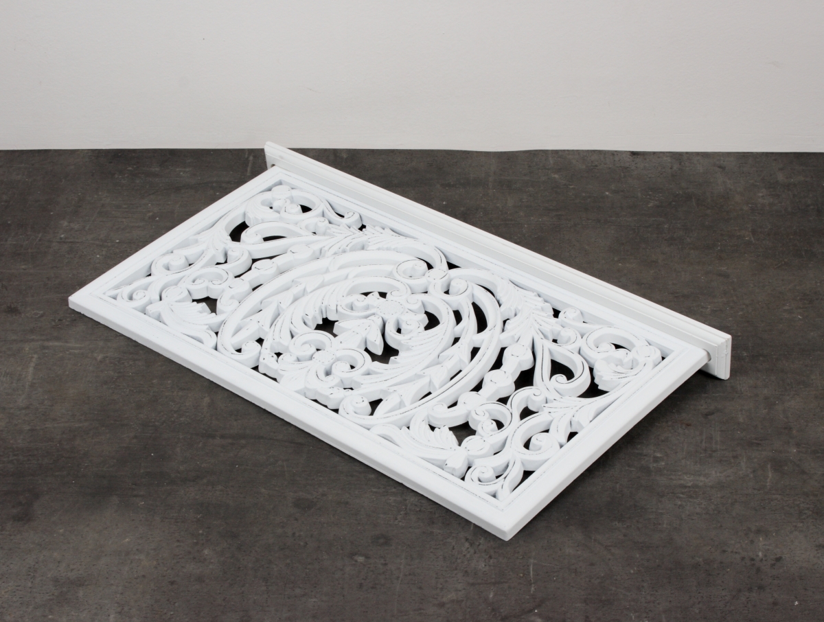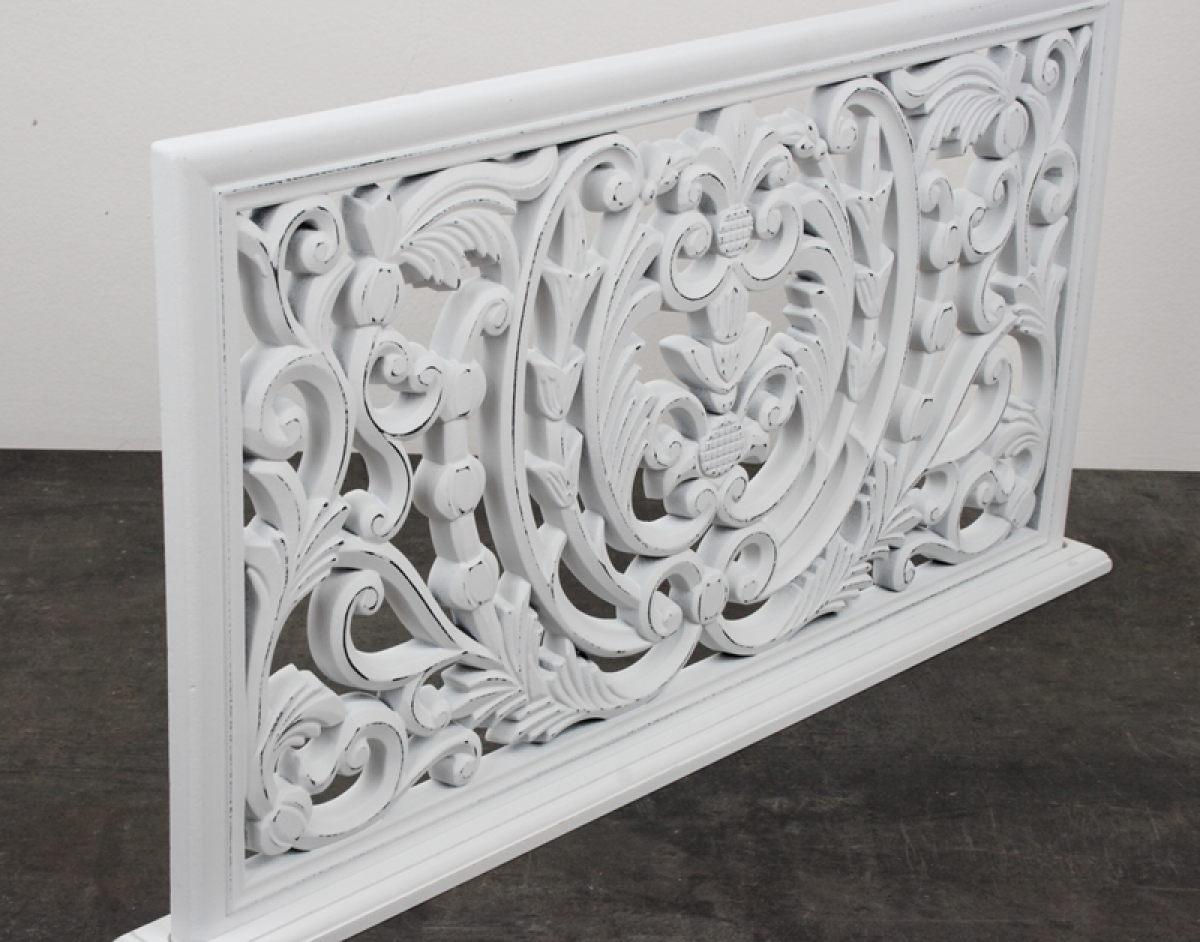 Vyrezávaná zástena v bielej farbe je doplnená o obľúbenú patinu. Tá dodáva dekoráciu ošumelá vzhľad a nádych starých časov.