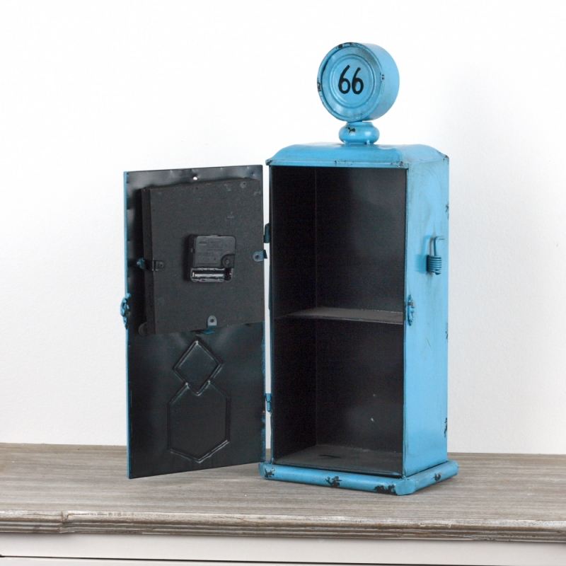 Modré kovové stolné hodiny majú otváracie dvierka na západku a vnútri priestor na drobnosti. Môžete ho využiť třebajako tajnú skrýšu alebo na odkladanie vecí, ktoré nepoužívate každý deň, ale chcete ich mať bezpečne uložené na svojom mieste.