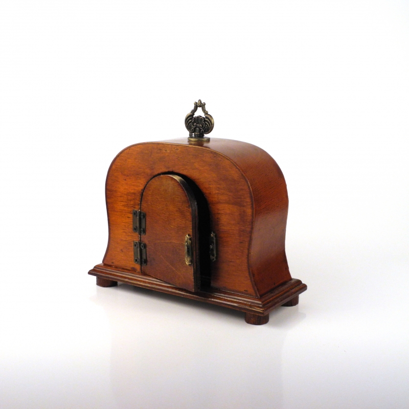 Retro doplnok k štýlovému nábytku. Farba - lakované tmavé drevo. Zo zadnej časti sú dvierka pre vloženie batérie do strojčeka hodín.