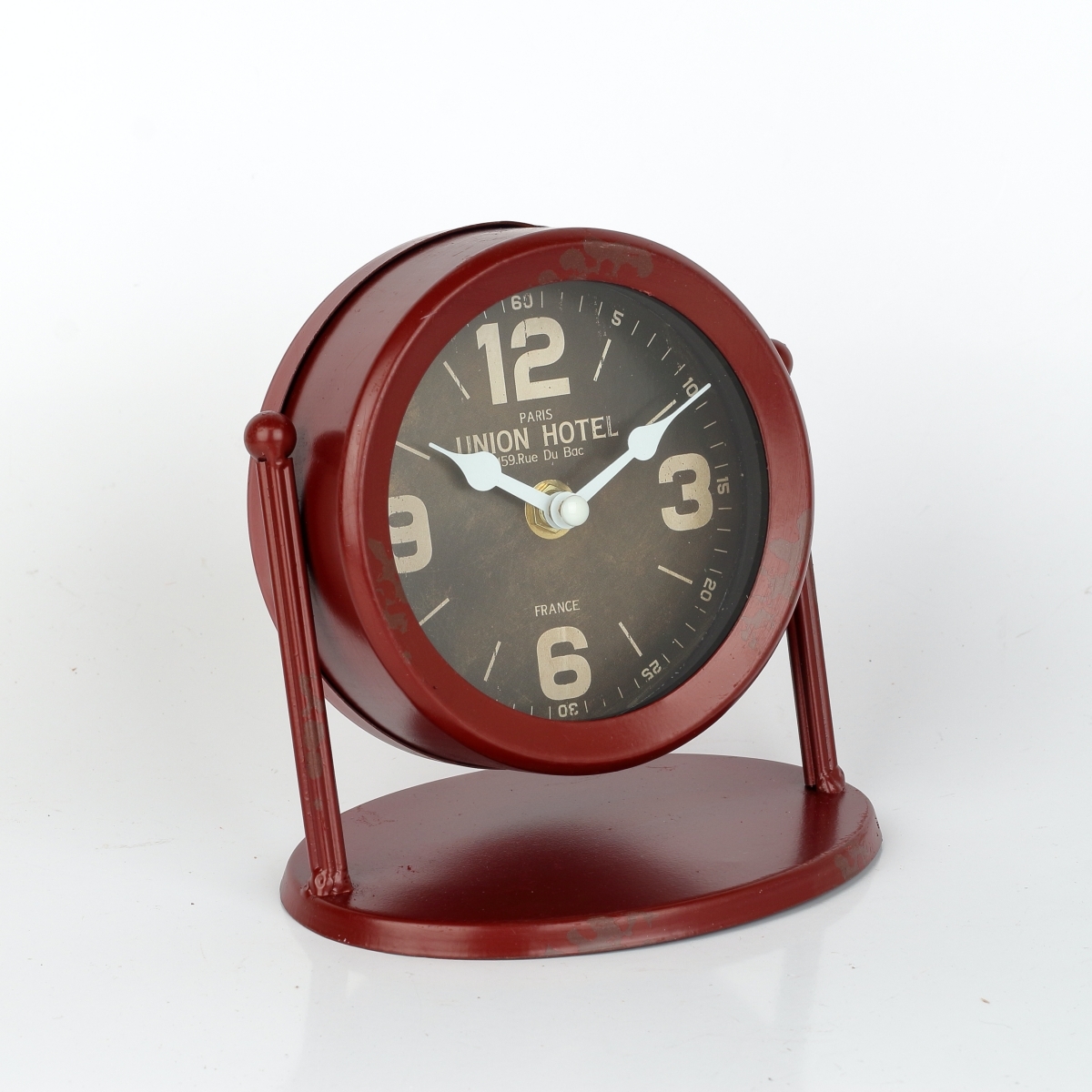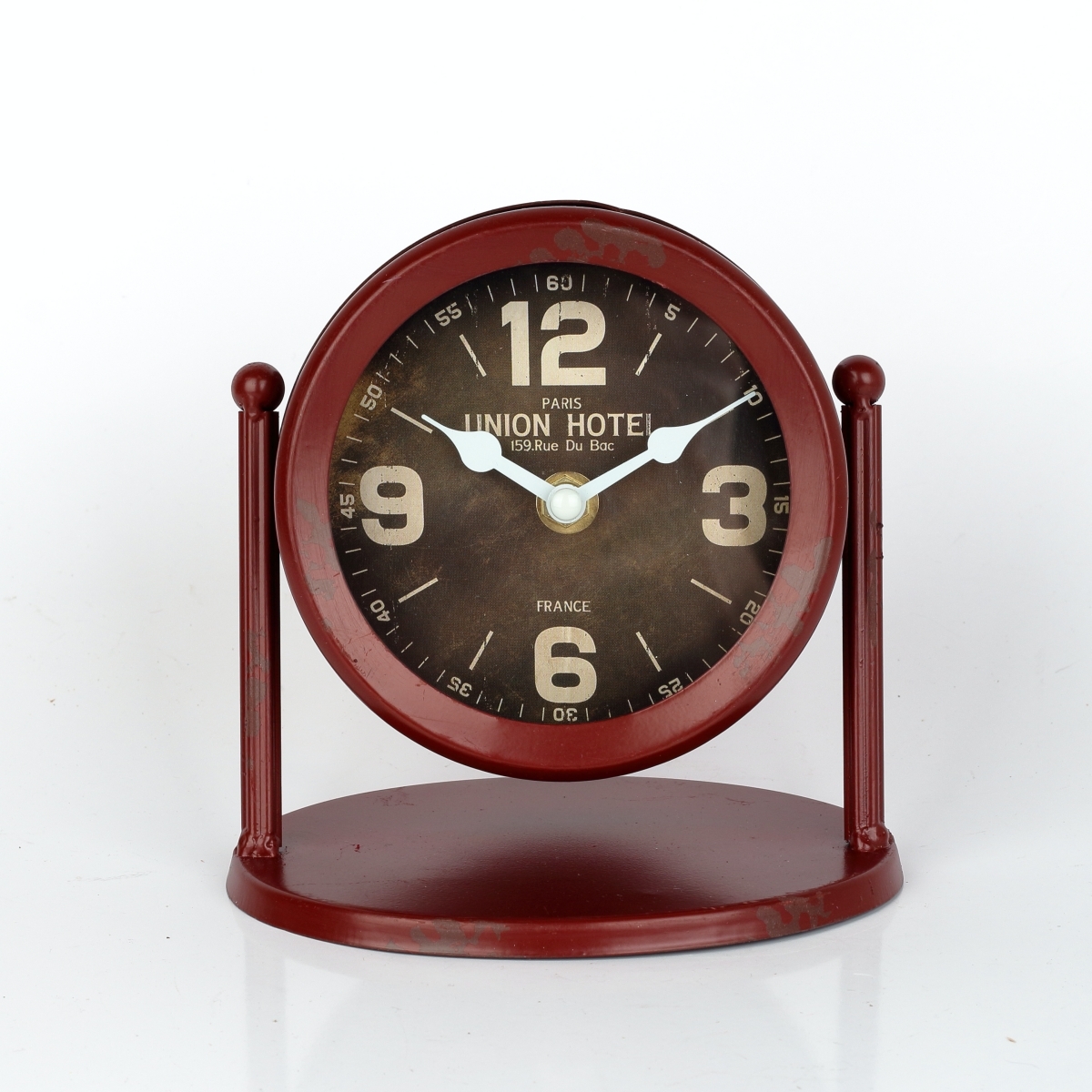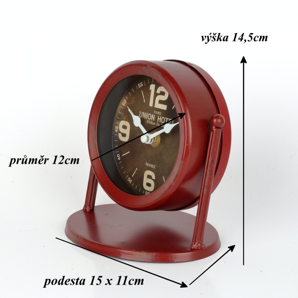 Stolové hodiny z kovu na podstavci v krásnej vínovej farbe